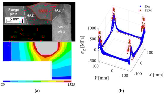 Validation of the numerical framework by comparing welding simulation-based (‘FEM’) (a) temperature field [°C] with fusion zone in macrograph (Tliq = 1525 °C) and (b) longitudinal residual stresses with contour method results (‘Exp’).