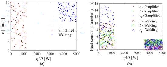 Parameters of the simplified and welding simulation by random Latin hypercube sampling: (a) travel speed and (b) heat source parameters versus net heat source power.