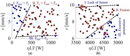 Process windows for (a) simplified model and (b) welding simulation. Outliers are denoted with red circles.