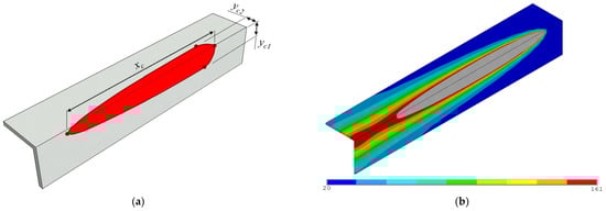 Random input variables of the parametric study are summarized in Table 3. Parameters affecting the heat input (net heat source power Q = ηUI and welding speed v), and the power density distribution (characteristic parameters of the double ellipsoidal heat source, therefore, a, b and cf with the restriction of cr = 4cf suggested in [] as an approximation), are considered as primary variables in the welding simulation and the simplified model. Variable ranges of the two modelling levels differ due to the phenomena during conventional flame heating and MIG/MAG welding. The range of net heat source power and travel speed considered in the parametric analysis for the box-section with a plate thickness of 4 mm broadly aligns with welding variables used in previous physical experiments carried out by the authors []. Flame heating is traditionally modeled as a Gaussian surface heat source for representing preheating [] or flame straightening []. In this study, the volumetric heat source is implemented with larger heat source parameters a, b, and cr than in the case of arc welding. Thus, the net heat source power is distributed over a larger volume in simplified models leading to the formation of locally lower temperature peaks and a shallow affected zone for considering only heating without filler material addition. On the contrary, a more concentrated heat source with smaller heat source parameters is required for liquification during welding resulting in high temperature peak and temperature gradient. Weld bead elements are expected to melt properly according to the calculated liquidus temperature of the base material in the case of welding simulation.