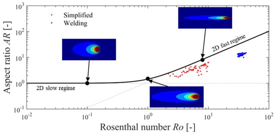 where Q = ηUI is the net heat source power considering thermal efficiency η, voltage U, and welding current I; λ is effective thermal conductivity, t is plate thickness, while ΔTc = Tc − T0 is temperature difference from the initial or preheat temperature T0 in the region of interest. The physical interpretation of the Rosenthal number is connected to the ratio of advection to conduction. Heat sources are classified as fast when advection is dominant over conduction (i.e., Ro ≫ 1), and as slow when conduction prevails over advection (Ro ≪ 1) []. To establish the relationship between the aspect ratio and the dimensionless Rosenthal number, Lu and Mendez [] formulated Equation (2) by combining asymptotic cases for slow and fast regimes. It was achieved using a blending technique with a blending parameter n = 1.972, resulting in an error of less than 3.3%: