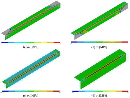 As an example, the residual stress results of a random welding simulation model are summarized in Figure 13a–c. The stress components in the X (σx, transverse), Y (σy, vertical), and Z (σz, longitudinal) directions are plotted in accordance with the coordinate system in Figure 4. It is shown that in-plane welding-induced residual stresses (σx and σy for the flange and web, respectively) are very low and varying between −5 MPa and 5 Mpa in general, except in the disturbed zones near the weld start and end, which are filtered out when examining the uniaxiality. Conversely, longitudinal stresses are dominating with maximum tensile residual stresses exceeding the yield strength, while magnitude of compressive stresses is ~150 Mpa in the middle cross-section. Away from the weld seam, compressive stresses appear in the constituent plates due to equilibrium of internal forces, with amplitudes much smaller than those of the tensile stresses. These conclusions are particularly true for both welding simulation and simplified models; both simulations give the maximum longitudinal residual stress near the corner joint. However, the stress peak decreases rapidly in the simplified heating simulation (Figure 13d). The primary reason is the lower heat input, the smaller amount of material exposed to temperature above the first yield temperature, and thus a narrower plastic zone with minimal plastic strains.