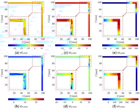 As outlined before in Section 3.1, a total of 59 simplified models and 51 welding simulation models satisfied the predefined criteria for subsequent mechanical analyses. Residual stress distributions of middle cross-sections are analyzed in detail hereafter by filtering out disturbed zones at the ends of the sections. Residual stress components are written to the hard drive by ANSYS, and the evaluation of data is processed in MATLAB R2020b []. First, the minimum and maximum envelopes of residual stress components σx, σy, and σz, and principal residual stresses σ1, σ2, and σ3 are plotted in Figure 14 and Figure 15, respectively for welding simulations to represent the stress ranges and extrema. Residual stress envelopes are generated by deriving either minimum or maximum of the analyzed component at each position by covering all the performed mechanical analyses of welding simulations or simplified models. Stress variation is basically concentrated to the vicinity of the corner, therefore, the region of interest is enlarged in the presented figures. Within the investigated range of variables, selected to ensure adequate fusion for practical applications, the results clearly demonstrate that σx and σy residual stresses are marginal, ranging between −35 MPa and 25 Mpa, similarly to second principal stresses σ2. On the contrary, longitudinal residual stresses are the governing stresses, with magnitudes varying from −120 Mpa to 440 Mpa, which are the practically lower and upper limits of third and first principal residual stresses σ3 and σ1, respectively.
