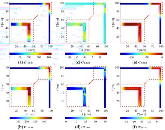 Minimum (σmin) and maximum (σmax) envelopes of principal residual stresses [MPa] for 51 welded specimens.