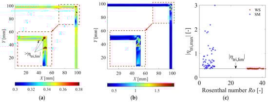 Figure 16a,b represents the maximum envelopes of stress triaxiality parameters for both simulation groups. Based on the results of 51 welded specimens, the envelope plot shows that |ηtri| only surpasses |ηtri,lim| in an extremely small local zone denoted by black arrows in Figure 16a. On the other hand, the maximum envelope of the 59 simplified models exceeds the defined limit in the entire cross-section. Notably, high values (~2) are observed near the heat source due to substantial thermal gradients during local heating. Similarly, dominant bending effects caused by three-dimensional heat flow, characterized by uneven temperature distribution through the thickness, results in a 3D stress state in the constituent plates in the simplified models. In Figure 16c, the relation between the Rosenthal number and the maximum stress triaxiality parameter |ηtri,max| for each analyzed case (thus, a total of 51 + 59 = 110 cases) is plotted. The black horizontal line, which represents the chosen limit for uniaxiality, clearly shows that uniaxiality holds for the evaluated welded specimens, while a three-dimensional stress state needs to be considered for simplified models (e.g., preheating or straightening).