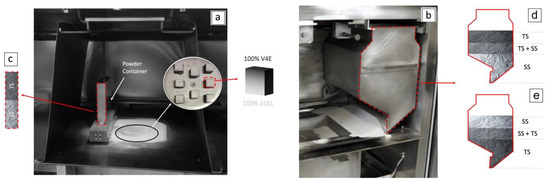 A similar procedure as described in Section 3.2.1 for the downscaled setup was replicated for the standard setup. Two configurations were implemented: “configuration II”, where the SS powder was placed at the bottom and TS at the top of the container, as presented in Figure 2d, and “configuration III”, where the TS powder was placed at the bottom and SS at the top, as presented in Figure 2e. In the case of the standard setup, an intermedium layer of a SS + TS powder blend was added in between the individual powders to tailor the gradual transition to a larger region in the final parts. The specific details concerning the volume of the powders available during disposal in the different configurations are summarized in Table 2.