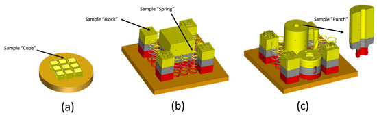A standard 150 × 150 mm SS start plate was used in the standard setup for the build jobs corresponding to configuration II and configuration III (Figure 3b,c). For configuration II, the build included different springs and solid blocks (maximum height z = 60 mm). The samples “block” and “spring” (see Figure 3b) were selected for characterization. In the case of configuration III, besides solid blocks and springs, the build job contained different drilling tools and a metal-forming punch (maximum height z = 80 mm). The sample ”punch” (see Figure 3c) was used for further characterization.