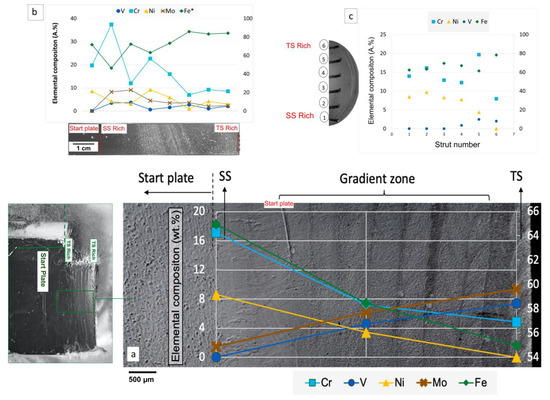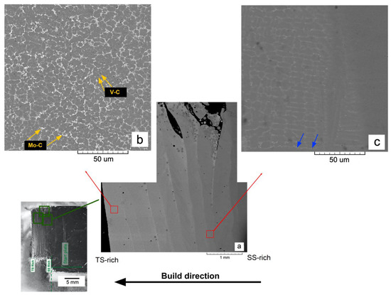 It is worth noting that the build strategy used yields a continuous material with no visible signs of cracks or significant porosity. The similarity in the process windows between the SS and TS, together with their compatibility in terms of the similar chemical composition (see Table 1) and thermal behavior (CTESS~16 μm m−1 °C−1 [54] and CTETS~11 μm m−1 °C−1, respectively, at 100 °C [55]), results in low residual stress concentration in the parts. The overall homogeneous nature of the microstructural transition indicates that a high degree of in situ alloying occurs in the specimen as it is manufactured. Focusing on each individual layer, it seems evident from Figure 4a that a higher concentration of carbides is aligned along the layer boundaries, probably due to remelting and melt pool fluid effects in combination with the specific heat distribution and solidification rate gradients.