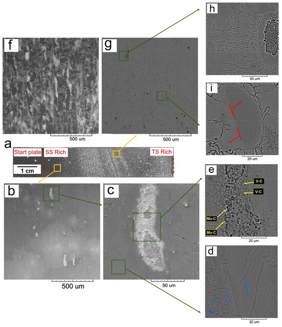 The low-magnification micrograph in Figure 5b outlines an area at 5 mm from the start plate (Z = 5 mm). It shows several isolated TS-rich islands (white contrasting areas) surrounded by a dark gray SS-rich matrix. Some of these islands with a reduced size appear in the SS matrix, forming a blurred “cloud” (light gray contrasted area), indicating some degree of in situ alloying. An area covering one of the islands is presented in the secondary electron (SE) contrast micrograph in Figure 5c. Higher-magnification micrographs using backscattered electron (BSE) contrast for SS-rich and TS-rich zones are shown in Figure 5d,e, respectively. The agglomeration of small Mo-rich (white) and V-rich (dark grey) carbides, clustered and forming TS-rich islands, is visible in the image in Figure 5e. A less etched SS-rich area with V-rich carbides decorating the grain boundaries is visible in Figure 5d. Another area of the cross-section in the TS-rich zone (at Z = 30 mm) is shown in the SE and BSE micrographs in Figure 5f,g, respectively. This zone is characterized by a higher density of white contrasting TS-rich islands in a less pronounced dark grey SS-rich matrix. It is clear that the microstructure is aligned in a columnar configuration along the build direction (z). The TS-rich islands showing a high degree of etching are again formed of small-sized carbide clusters, as shown in Figure 5h. The SS-rich zones are characterized by zones of variated grayscale contrast (because of due differential etching intensity), indicating a variating degree of in situ alloying, with carbides aligned along the grain boundaries. This is shown in the micrograph in Figure 5i.