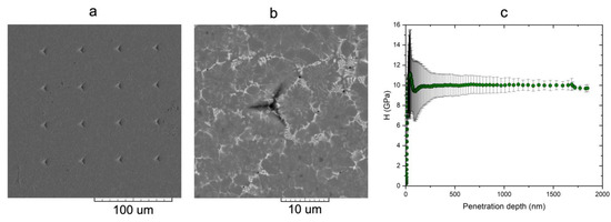 SEM micrographs of a 4 × 4 grid of nanoindentations created at the polished top surface of the sample cube (a). Higher-magnification image of one of the indentations (b). Average hardness (H) as a function of the penetration depth (c); standard deviation is included as error bars.