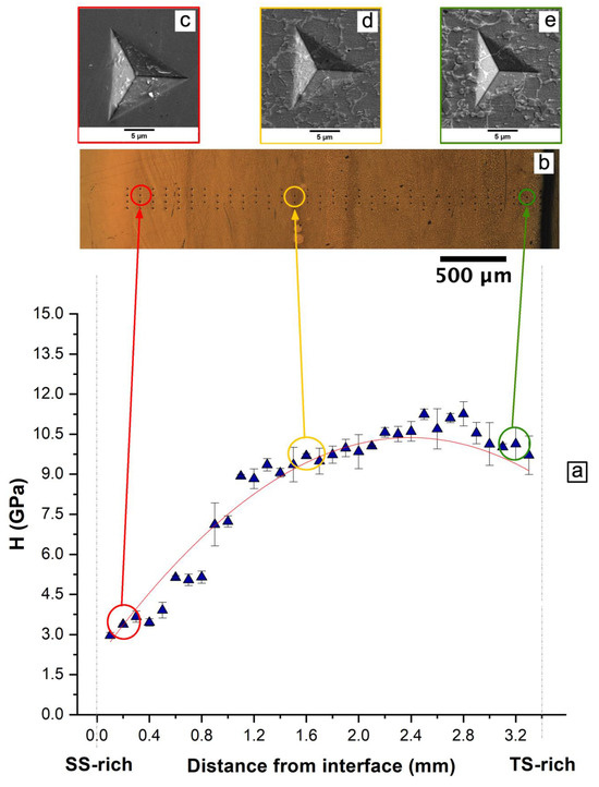 A profile with the nanoindentations forming a 4 × 33 grid was created on the cross-section of the cube specimen to track the local changes in the mechanical properties of the material. Figure 8a presents the changes in the nanohardness values across the functional gradient transition. Figure 8b presents an optical image of the nanoindentation grid. Figure 8c–e illustrate typical indentation imprints at different sample locations. Here, the bottom SS-rich areas of the specimen are located to the left in the image in Figure 8a (horizontal axis starting from 0), and TS-rich areas are located at the right side of the image (horizontal axis closer to 3.2 mm). A gradual increase in hardness can be observed in the graph (Figure 8a) as the material gradually changes from SS to TS. The hardness values evolve from H~4 GPa in the first few layers (bottom, SS) to H~10.5 GPa in the top layers (TS) (values comparable to the H values measured from the top surface; see Figure 7c). The hardness values recorded for the first SS-rich layers are similar to the values reported for the nanoindentation of 316L samples manufactured by PBF-EB [9,16]. The hardening of the material, as it is enriched in TS, can be explained by the combined action of three mechanisms directly related to the microstructure: the increase in the density of hard Mo-rich and V-rich carbides, the austenitic to martensitic transition in the parent matrix phase, and the effect of microstructure refinement due to the pinning of the columnar grain growth. The gradual increase in the density of carbides can be observed in the residual micrographs of selected nanoindentations in the SEM micrographs in Figure 8c–e.