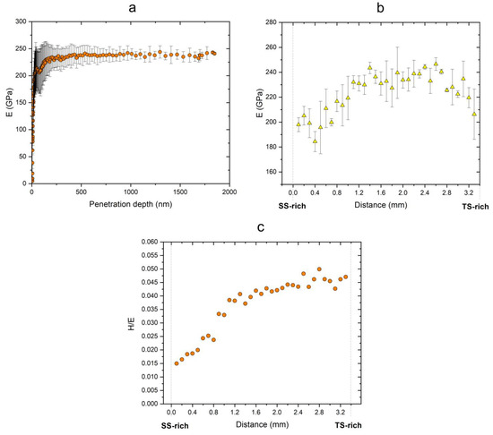The stiffness value, represented by an indentation elastic modulus (E), was also extracted from the nanoindentation experiments performed on the specimen cube. The average E value changes with the increasing indenter penetration depth, as measured on the polished TS-rich top surface of the specimens, are presented in Figure 9a. The results show stable E values of around 240 GPa. The evolution of E across the polished cross-section of the same specimen is presented in Figure 9b. As with the hardness values, gradual stiffening is observed as the material is enriched in TS. The stiffness values increase from E~180–200 GPa in the first SS-rich layers to E~230–250 GPa in the TS-rich zone near the top of the specimen (these values are in correspondence with the E values measured in the experiments on the top surface). Again, the E values found here for the SS-rich materials in the first few layers are comparable to the previously reported ones for PBF-EB 316L samples [9,16].