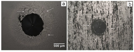 Residual tracks of Rockwell experiments in the SS-rich (a) and TS-rich (b) areas on the polished cross-sections of the block specimen. Both micrographs have the same scale. The arrows point to deformation behavior (slip planes in (a) and residual plastic mechanisms of deformation in (b)).