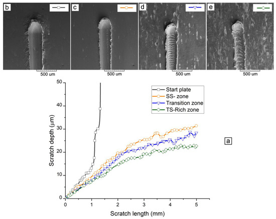 Plots of scratch depth vs. scratch length for different experiments carried out along the cross-section of the specimen block (a). SEM micrographs of the residual tracks focused at the top end of selected scratches: at the start plate (b), in an SS-rich zone (c), in the transition zone (d), and in a TS-rich zone (e).
