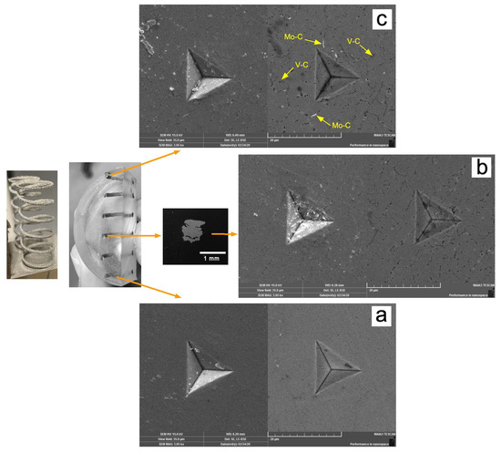 To evaluate the local changes in the intrinsic stiffness with the compositional gradient, nanoindentation experiments were conducted on the polished cross-sections of individual turns of the sample spring (built following configuration II; see Figure 3b). The residual imprints after the tests on turn 1 (SS-rich zone) are shown in the SEM micrograph in Figure 13a; for turn 3 (transition zone) in Figure 13b; and for turn 6 (TS-rich zone) in Figure 13c. The gradual transition in the microstructure from the SS-rich material with no carbides (Figure 13a) to the TS-rich material with both Mo and V carbides (Figure 13c) is evident.