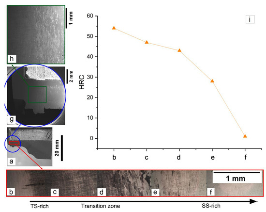 Figure 15i presents the profile of the Rockwell hardness measured along the cross-section of the punch. A gradual transition in hardness is recorded from the hard punch head, with hardness values characteristic of TS (H~54 HRC, similar to the specimen block and references [13,14]), to a soft punch core, with hardness values comparable to the ones measured for SS.