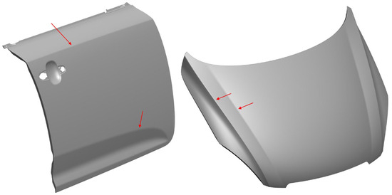 On automotive outer panels there are many lines, such as feature lines, character lines, crease lines, etc., as shown in Figure 1 [1]. Even if car designers define each line differently, the definition of a line is not geometrically clear to engineers. In this paper, we use the term ‘feature line’ for very narrow and long curved surfaces. Feature lines are pressed or folded lines on the automotive outer panels that are visually noticeable on smooth or planar surfaces [2,3]. Though called lines and appearing line-like, they are geometrically defined as curved surfaces. Geometrically, feature lines are created by the blending of two different planes or smooth surfaces.