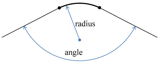 A feature line is a blend surface that smoothly connects two primary surfaces and is typically a long and narrow surface. In this paper, we focus our study on the shape of the vertical cross-section, which determines the sharpness of a feature line. The vertical section of the feature line surface can be represented by a circular arc. Therefore, the shape parameters of the feature line can be the angle of the two tangent vectors at the ends of the arc and the radius of the arc, as shown in Figure 2. This means that the two parameters, angle and radius, uniquely define the cross-section of the feature line.