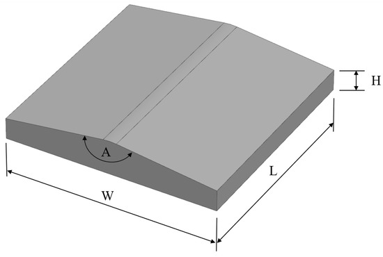 Geometric model of the specimen: width (W), length (L), height (H), and angle (A).
