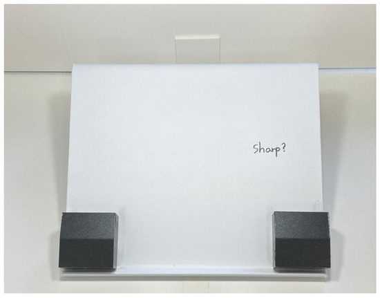 In our experiment, the two specimens are placed on a flat white plate on a table in a room, as shown in Figure 4. The angle between the plate and the table is 25 degrees and the illuminance on the plate is approximately 500 lux with indirect lighting. The distance between the two specimens is approximately 150 mm. In a pair of the specimens, one is the reference specimen, and the other is the comparison specimen. The reference specimen is always the same, but the comparison specimen is different. The radius of the feature lines up in the comparison specimen changes. The comparison specimen is randomly selected, and the position of the specimen (left or right) is also randomly selected. The subject is not allowed to touch the specimens.
