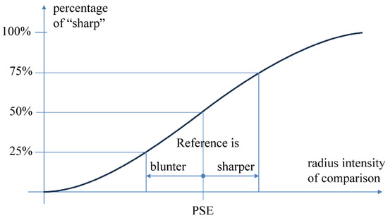 As a preliminary test, you should first find the radius range of the comparison specimens. You can determine the range of the radius by measuring the percentage of responses that the reference specimen is sharper than the comparison specimen. The larger the radius of the comparison specimen compared to the radius of the reference specimen, the higher the percentage of responses; conversely, the smaller radius of the comparison specimen is compared to the radius of the reference specimen, the lower the percentage of responses. The minimum and maximum values of the radius range correspond to 0% and 100%, respectively, indicating that the reference specimen is perceived as sharper.