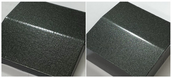 In the main test, we used three sets of specimens because we studied three feature lines with different radii. Each set includes one reference specimen and nine comparison specimens as shown in Table 1. A total of 13 comparison specimens, ranging from 4 to 16 mm with 1 mm intervals, and 3 reference specimens with radii of 8, 10, and 12 mm were made by milling, not 3D printing. The surface finish of the specimens printed on a 3D printer was not suitable for the main test: the print pattern was visible even after being wrapped with film. Figure 6 shows the difference between the printed and milled samples. A 30 mm diameter ball-end mill was used for milling, with a zigzag toolpath perpendicular to the feature line with a pitch step of 0.3 mm. The arithmetic cusp height is less than 1 micrometer (0.00075 mm). All specimens were wrapped with a film (CMF-04002, Tools International, Tokyo, Japan), which is a purpose-engineered colored sheet material utilized in automotive clay modeling process.