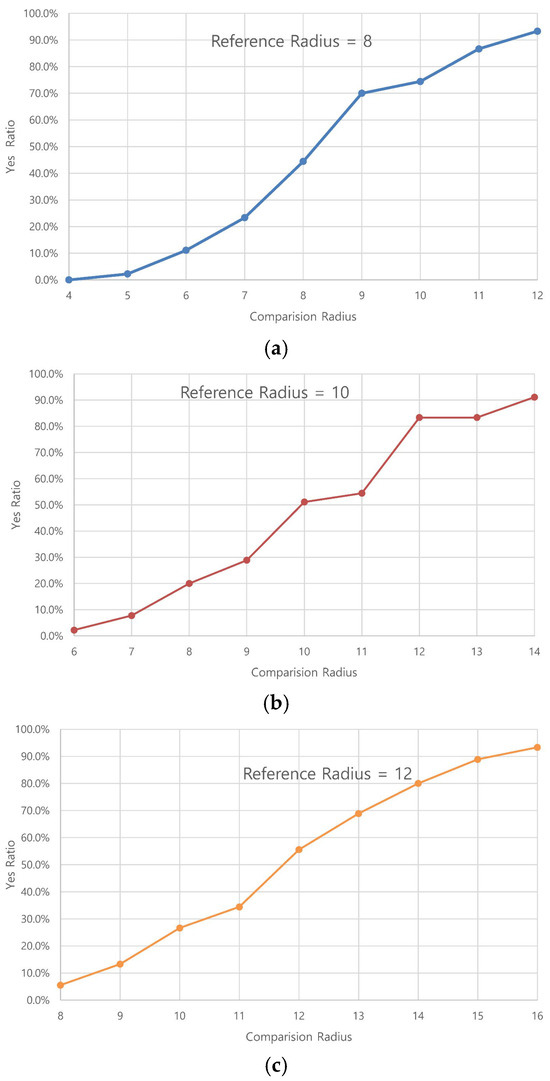 Second, for a sensory test, the response should typically be 0% at the lowest intensity and 100% at the highest intensity, and the comparison pairs should be unambiguous to anyone. In the results shown in Figure 7, the response at the largest radius is less than 100%. For the preliminary test, we used 3D-printed specimens that may not be geometrically accurate. For the main test, a slightly wider range of radius is recommended than the preliminary test result.