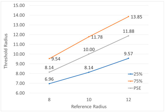 Figure 7 shows the results of the overall test, and Table 2 shows the noticeably smaller radius and the noticeably larger radius for each reference radius. The threshold radius values in the table are linearly interpolated. The difference thresholds are 1.48, 1.57, and 1.81 mm for the radii of 8, 10, and 12 mm, respectively. The slope of the threshold radius and the PSE (point of subjective equivalence) as the radius increases is shown in Figure 8. The slope of the threshold is almost linear, and the amount of the difference threshold increases as the radius increases.