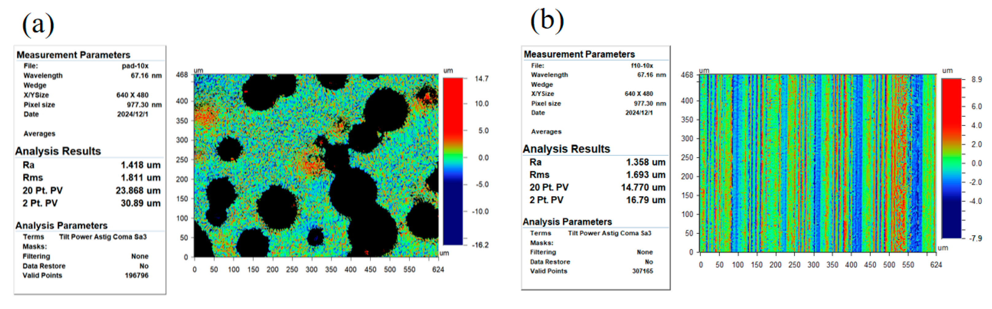- Wang, Z.; Wang, Z.; Liang, Y.; Meng, F.; Cui, Z.; Chen, T.; Yang, Y.; Fan, C.; Yu, T.; Zhao, J. Modelling of polyurethane polishing pad surface topography and fixed-point polished surface profile. Tribol. Int. 2024, 195, 109646. [Google Scholar] [CrossRef]
