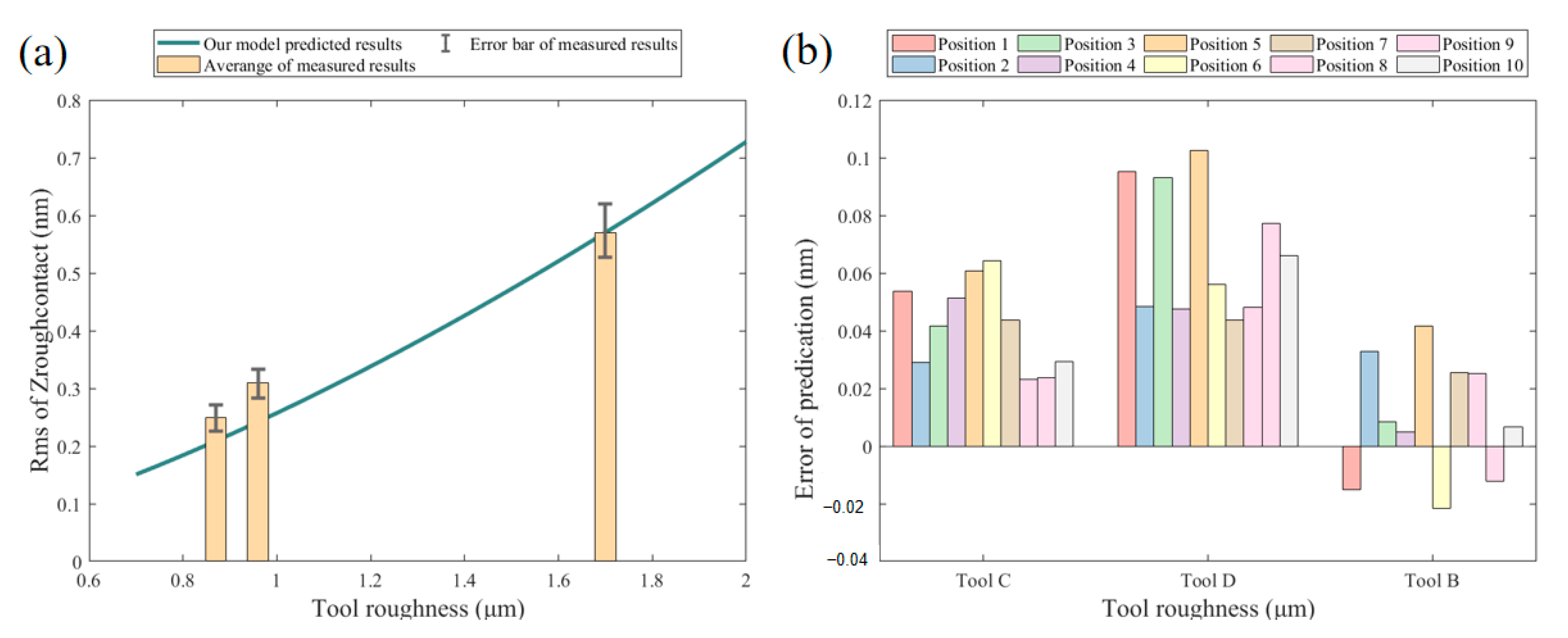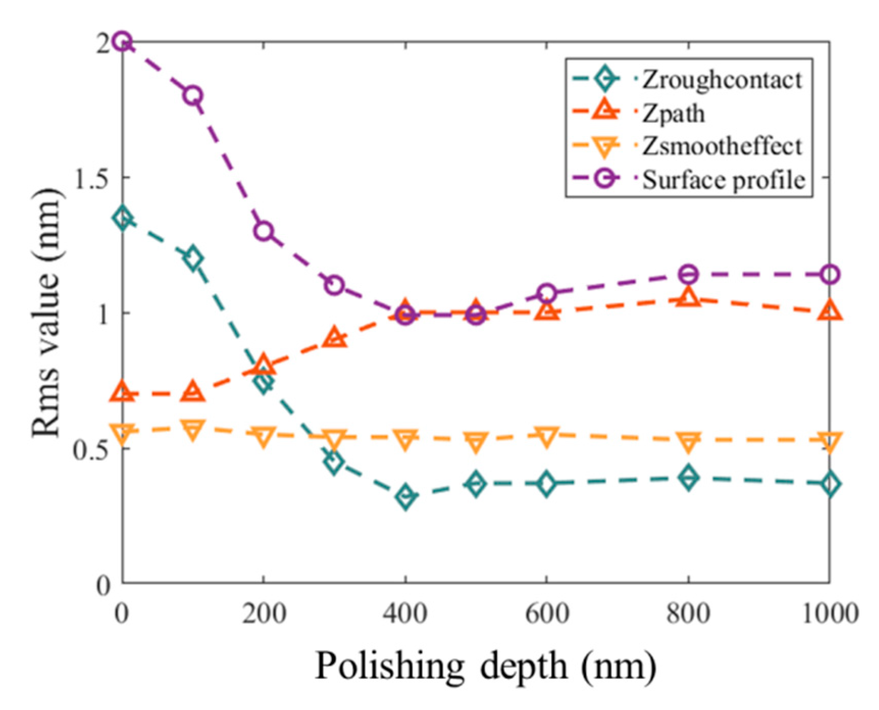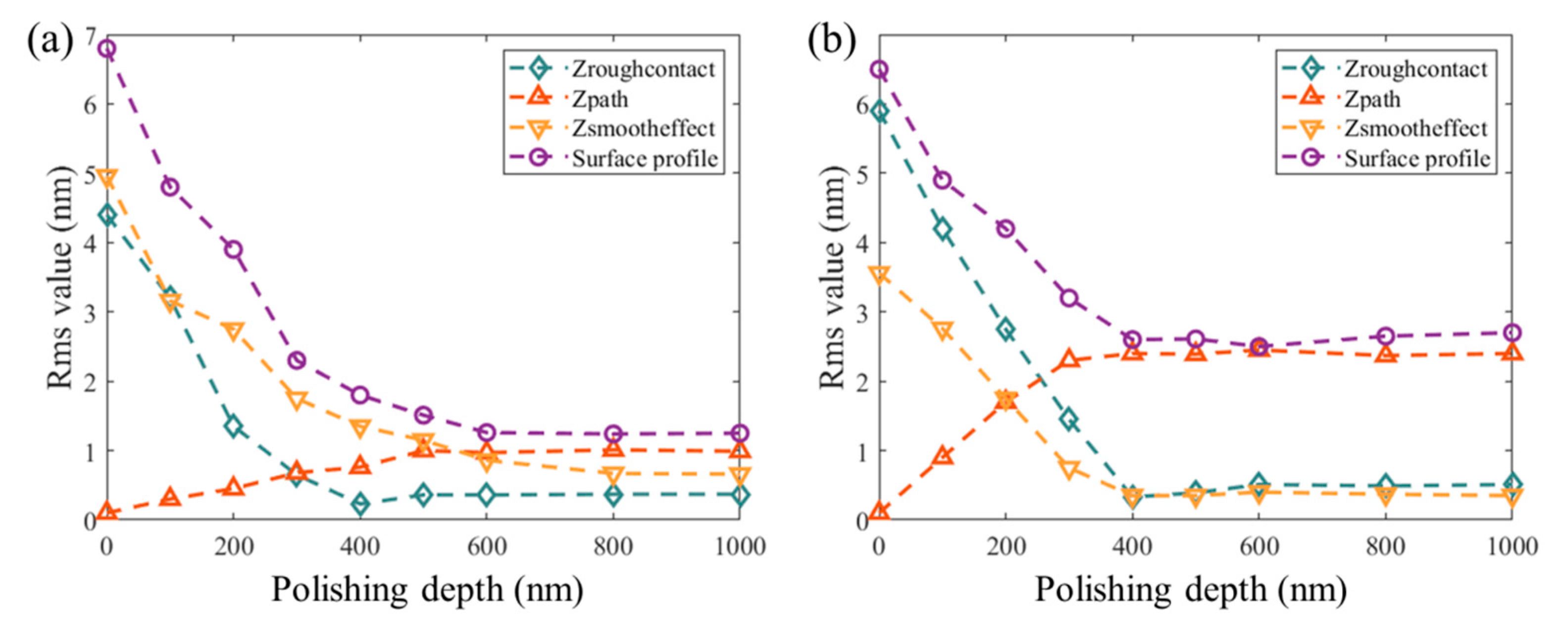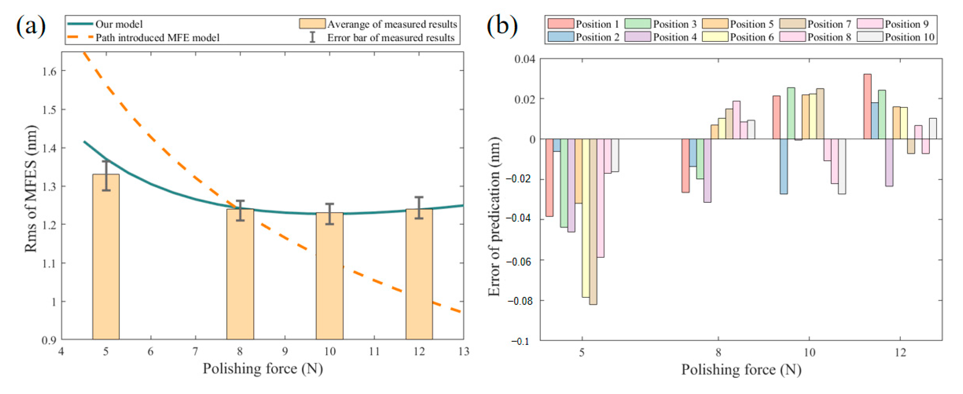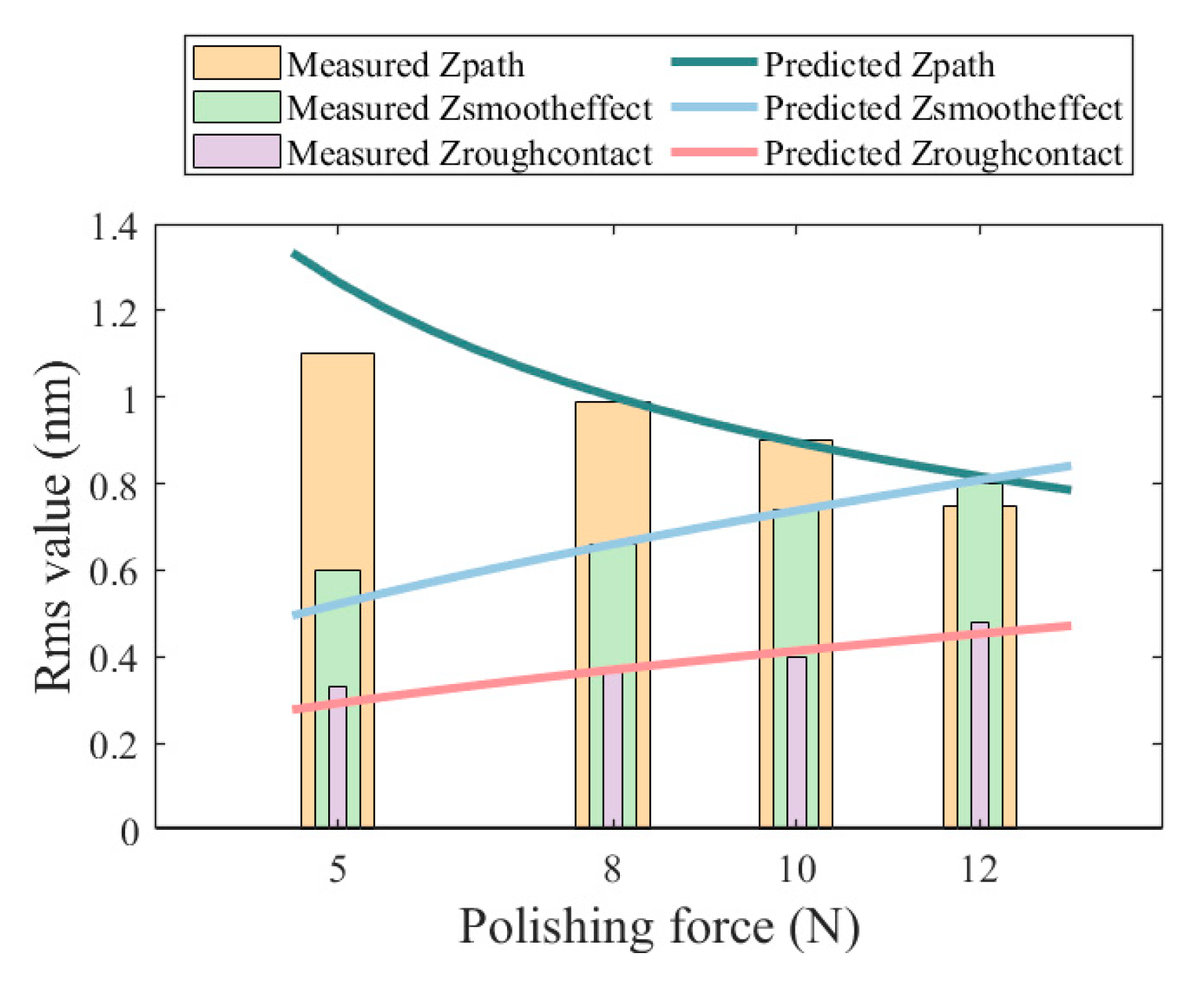 - The effects of tool roughness, polishing force, and path spacing were systematically investigated in this study. The model indicates that reduced tool roughness and smaller path spacing contribute to MFEs. In contrast, the relationship between the polishing force and MFEs is non-linear: The MFEs initially decrease with increasing force but begin to rise once the force is larger than a certain value;