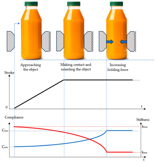 Starting from the phases of the gripping process of an object, Figure 1 shows also how compliance and rigidity of the gripper should vary in time (blue and red curves, respectively). In the approaching phase of the jaws to the object to be gripped, the rigidity of the system has to be great, and the compliance minimal. After achieving the contact between the jaws and the object to be gripped, in order to prevent its deforming, the compliance of the system has to reach its maximum, and the rigidity has to tend towards its minimum. The form of the compliance curve has to be concave, indicative of the fact that at the beginning of the gripping process the gradient of compliance increase is small. In phase of firm fixing of the object between the jaws by increasing the holding force, compliance has to increase rapidly, tending towards maximum values.