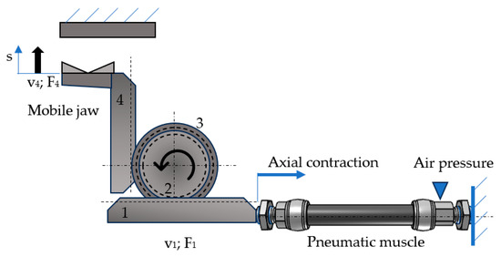 The input quantities of the system are the speed (v1) and the force (F1) developed by the pneumatic muscle. These are transmitted to the jaws via two rack and pinion mechanisms (1–2 and 3–4, respectively). The output of the system represents its exterior connection to the jaws of the gripper and is characterized by speed v4 and force F4.