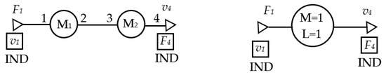 Later, the motion transmission function v4 = f(v1) and the transmission function of the forces F1 = f(F4) will be determined.