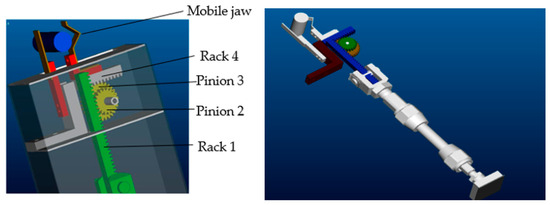 The constructive variant shown in Figure 2 proposes an asymmetrical solution with a single mobile jaw, gripping being achieved by form and friction. Between the motor (the pneumatic muscle) and the end elements (the jaws), a mechanism consisting of rigid elements is interposed, namely two rack and pinion mechanisms.