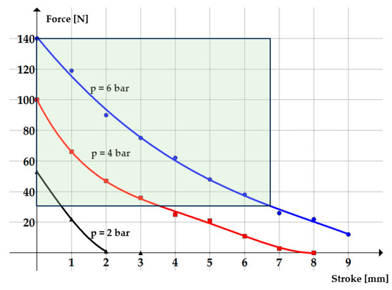 The selected pneumatic muscle is required to have the capacity of generating a force of at least 32.064 N; its operational range is marked green in Figure 5. Thus, for example, at a charging pressure of 6 bar of the compressed air, the maximum stroke of the pneumatic muscle is about 6.7 mm, and at a charging pressure of 4 bar, the stroke is 3.5 mm.