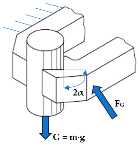 The gripper was dimensioned considering a mass of m = 0.5 kg of the object to be gripped. The object is to be lifted with an acceleration of a = 5 m/s2. Further input data are gravitational acceleration: g = 9.81 m/s2; friction coefficient jaw/object: µ = 0.2; safety coefficient: S = 2; V-jaw angle 2∙α = 120° (Figure 6). For these values, the necessary force for retaining the object, FG, is determined by Equation (13):