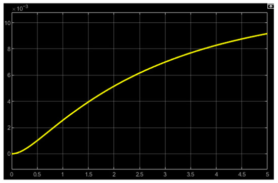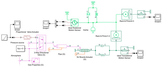 The compressed air further reaches the Air Muscle Actuator block with characteristics in accordance with the Chou and Hannaford model [30]. The charging with compressed air of the pneumatic muscle determines its axial contraction, the variation in that versus time being shown by the Scope2 block (Figure 9).