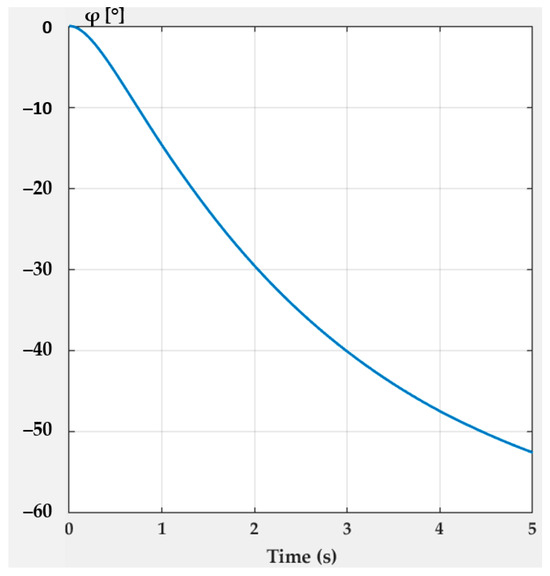 Charging the pneumatic muscle with compressed air at a pressure of 6 bar causes a displacement of its free end and implicitly of rack 1 by 9 mm. On its turn, the rack determines the rotation of gears 2 and 3. The variation versus time of the rotation angle is shown in Figure 10.