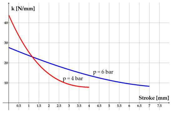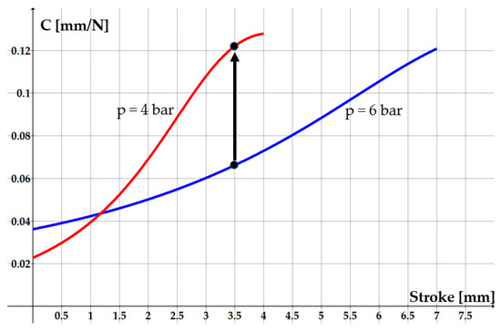 Of particular interest in analyzing this gripper system is the high-pressure range 4 and 6 bar (the area marked green in Figure 5). For these two pressures, Figure 13 and Figure 14 show the variation in rigidity and compliance, respectively, versus the stroke of the jaw.