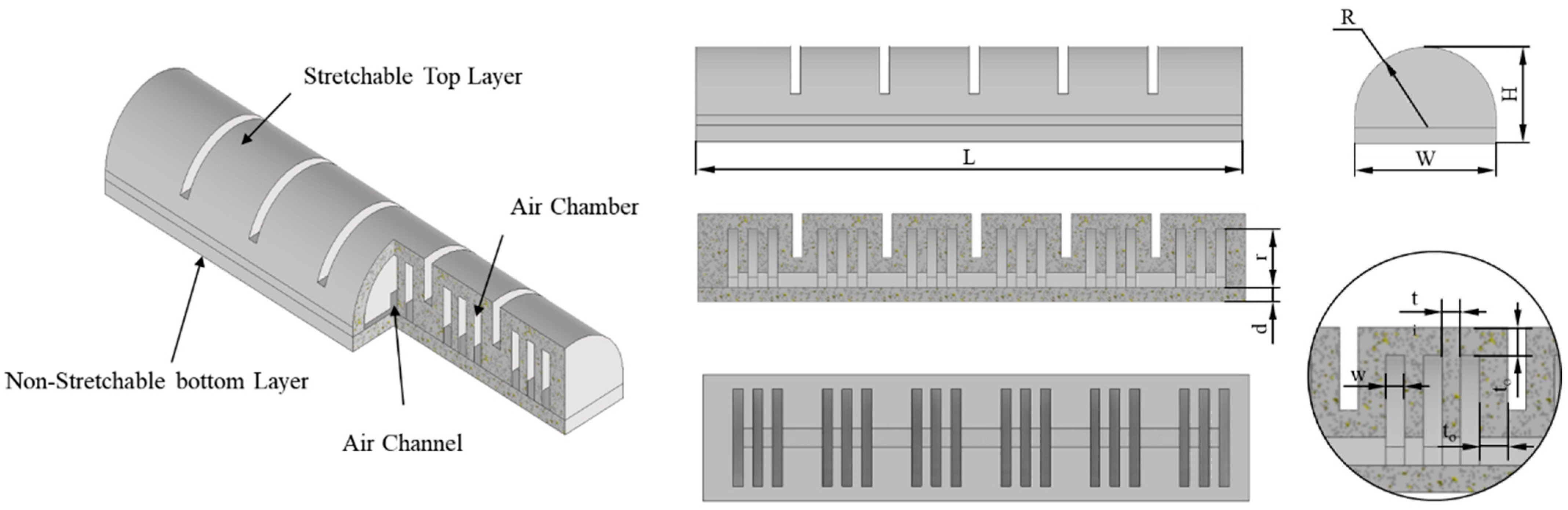- Kim, D.; Baek, S.R.; Kim, M.S.; Park, C.Y.; Lee, I.H. Design and manufacturing process of pneumatic soft gripper for additive manufacturing. Sens. Actuators A Phys. 2024, 370, 115218. [Google Scholar] [CrossRef]