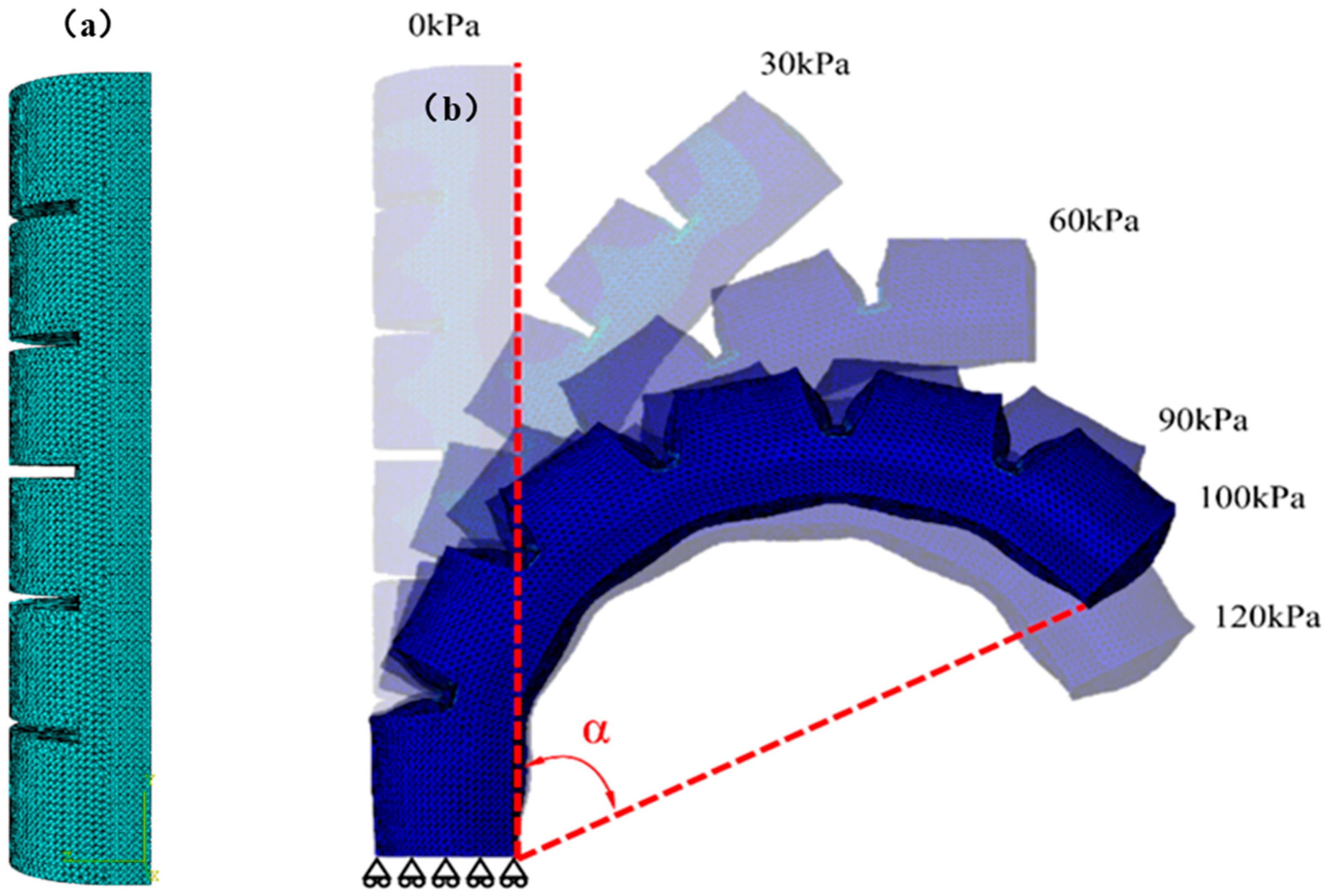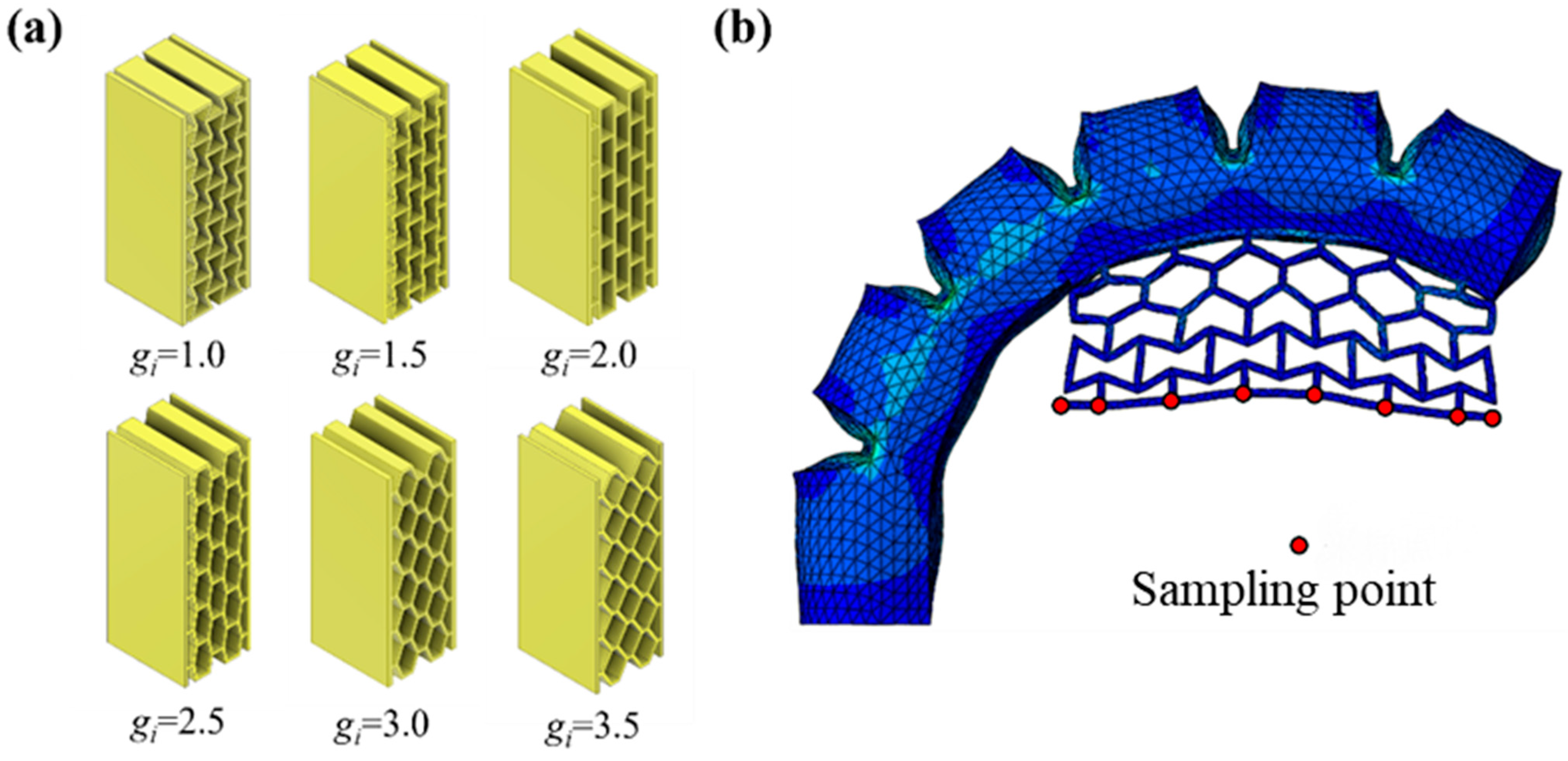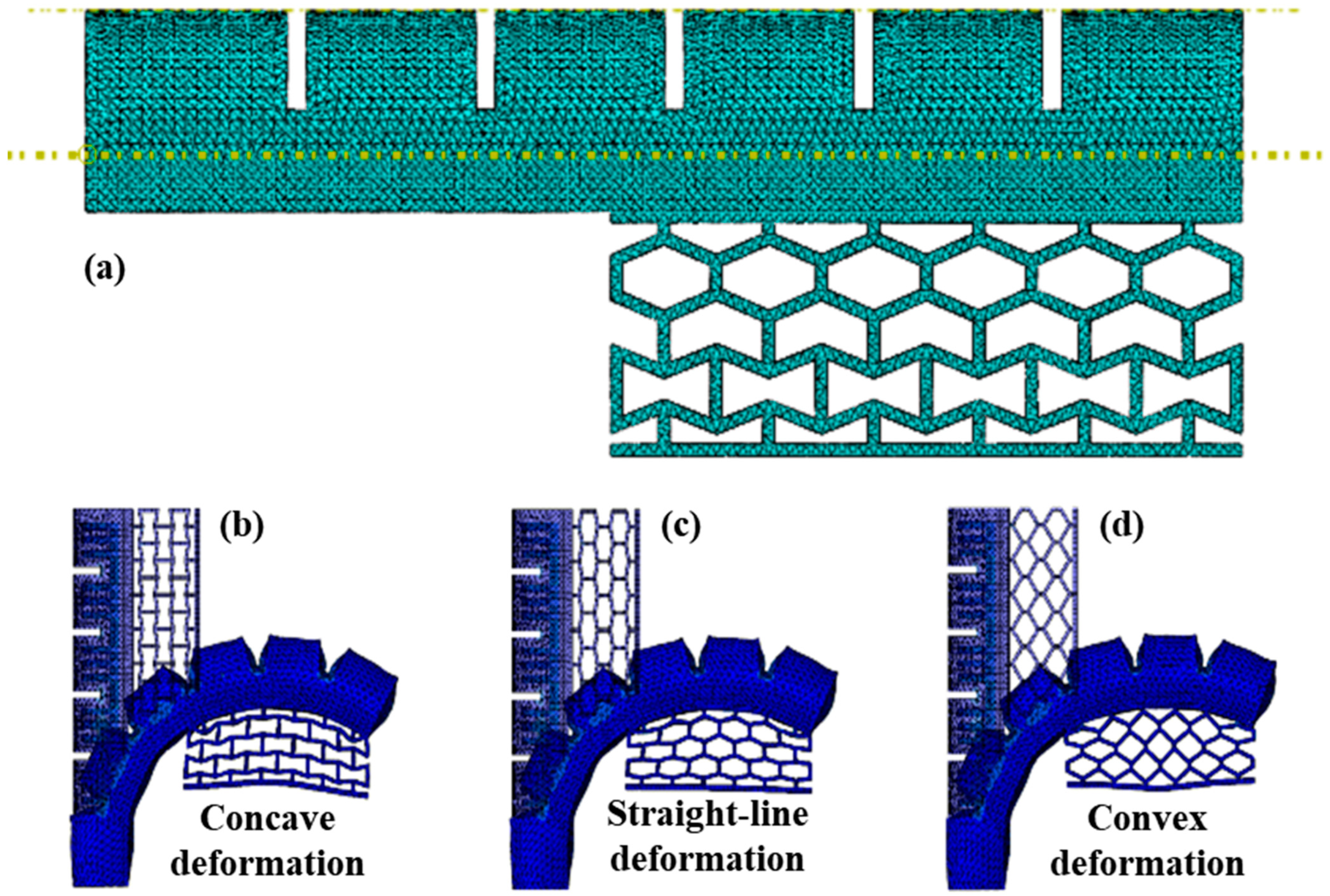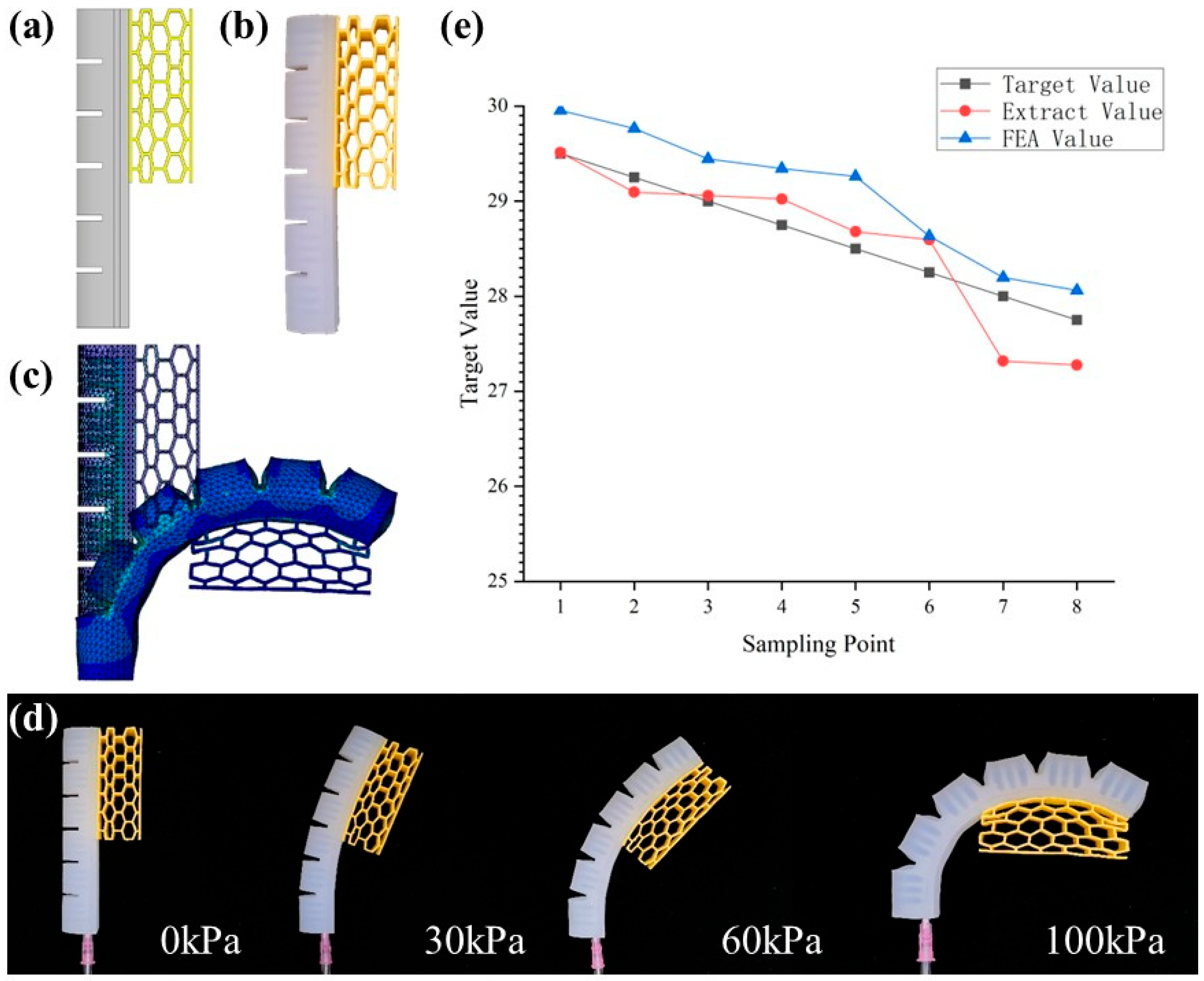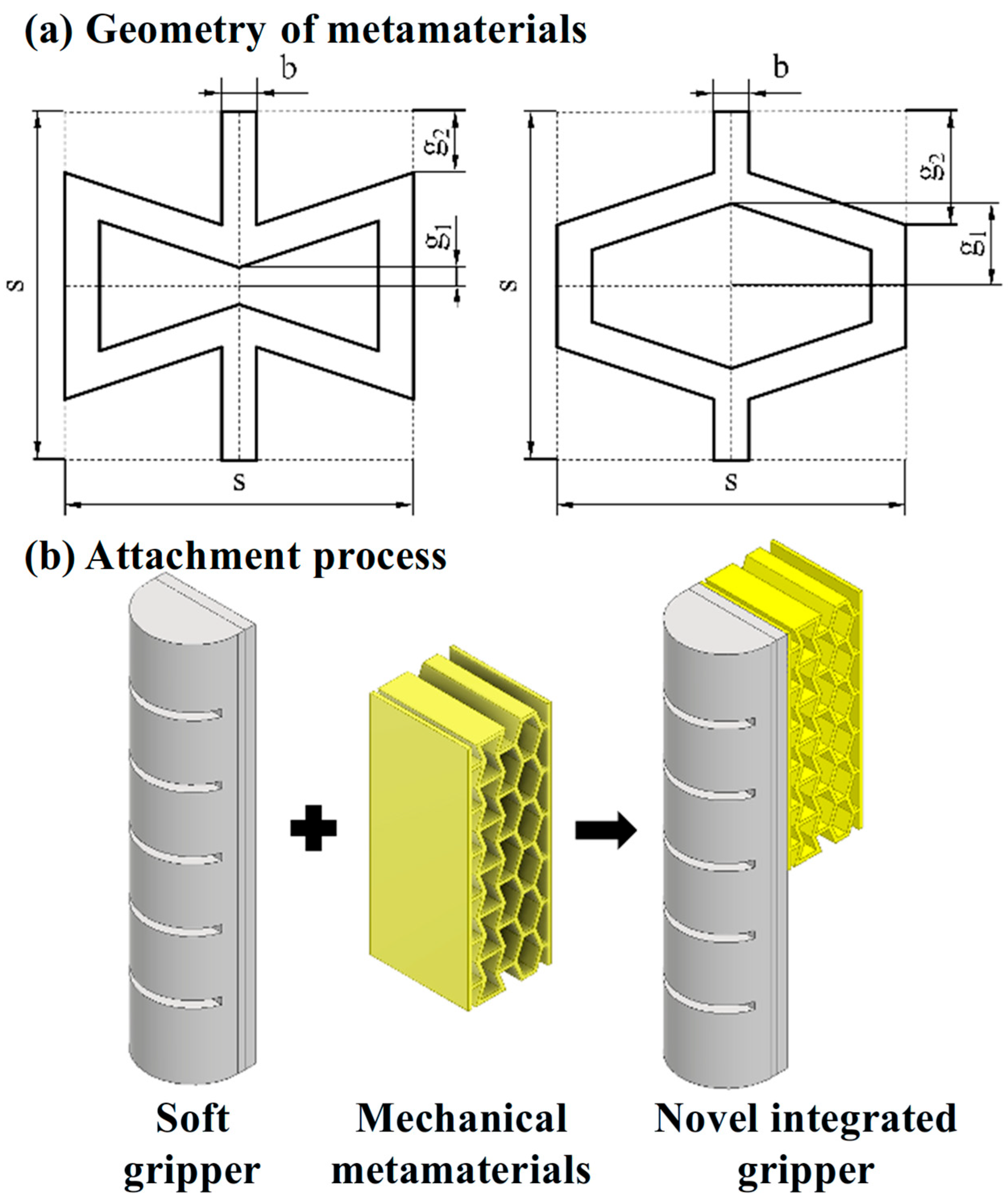 - This study presents the structural design of an integrated gripper, validated through FEA to ensure feasible deformation under pneumatic loads. The incorporation of Gibson hexagonal unit-based metamaterials enables tailored surface deformation, significantly improving contact conformity with complex object geometries.