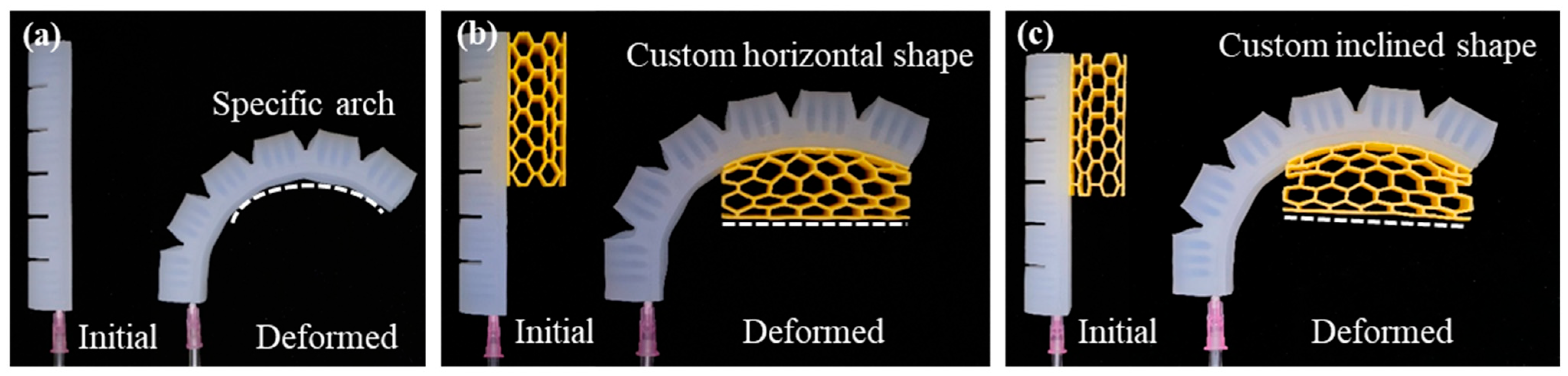 - Dikici, Y.; Jiang, H.; Li, B.; Daltorio, K.A.; Akkus, O. Piece-by-piece shape-morphing: Engineering compatible auxetic and non-auxetic lattices to improve soft robot performance in confined spaces. Adv. Eng. Mater. 2022, 24, 2101620. [Google Scholar] [CrossRef]