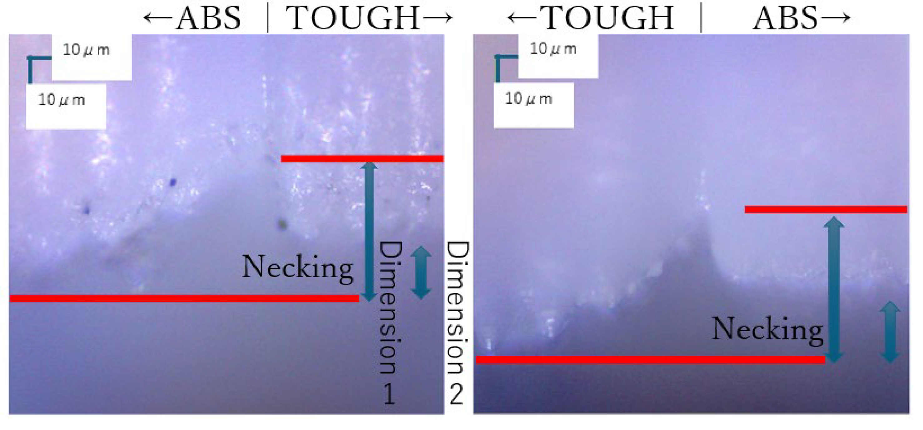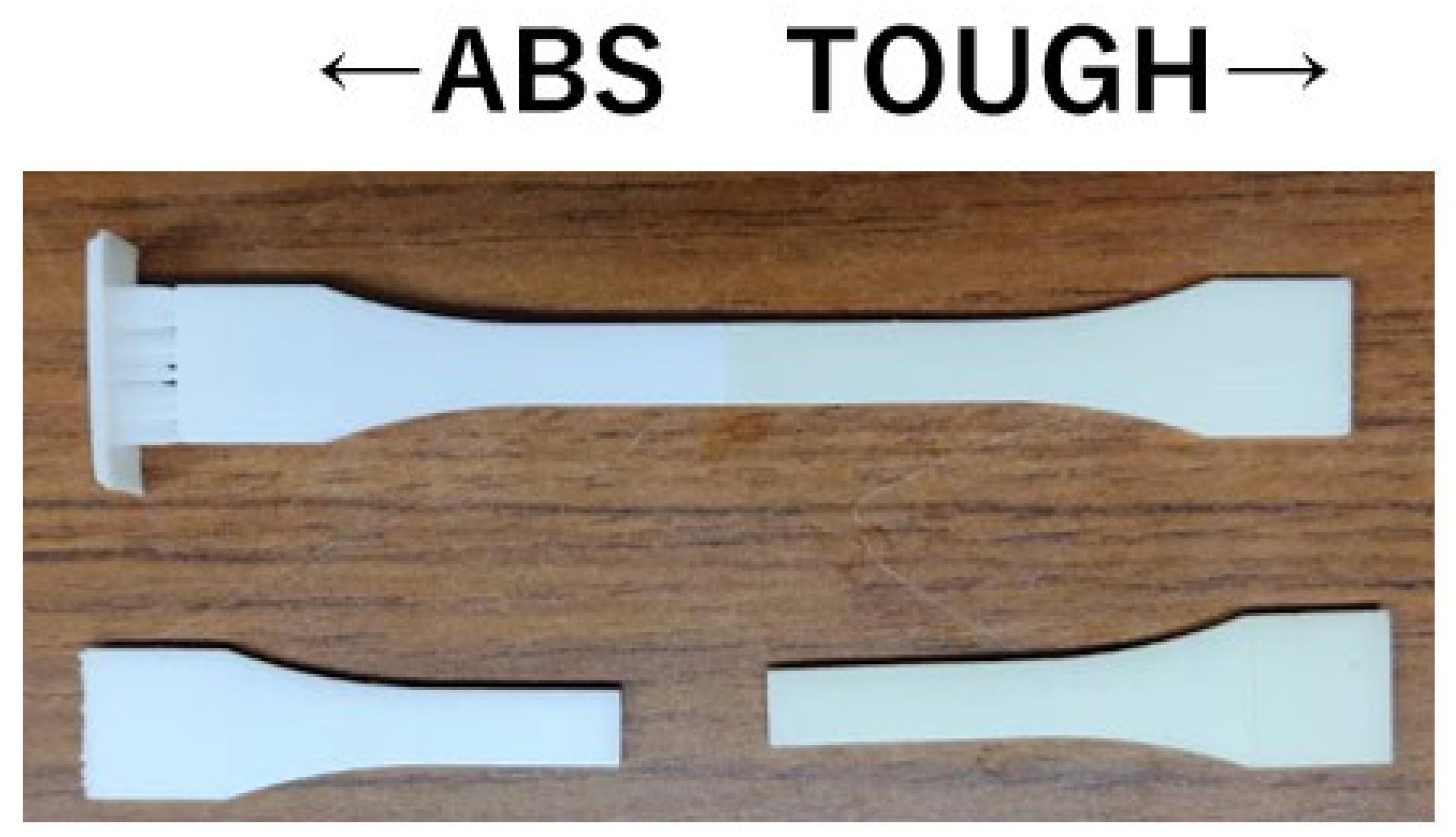 - The tensile strength of the multi-material specimens was found to be more than 90% of the weak tensile strength of the single-material specimens. Elongation was less than 55% of that of the single-material specimen. The tensile strength of the resin exceeded the lowest official value of the resin, and it is considered that there no problem would be met when using the resin for personal use in terms of strength;