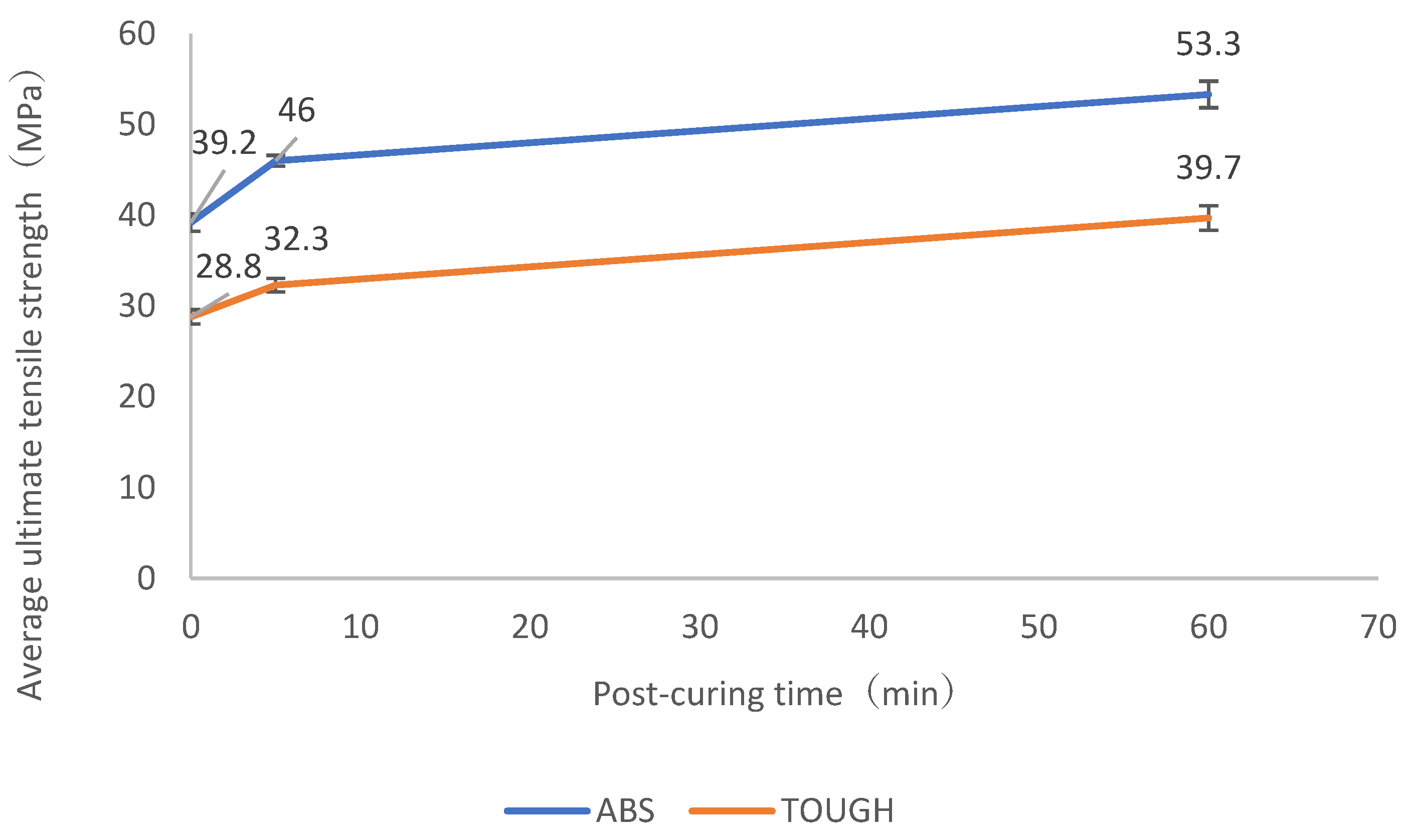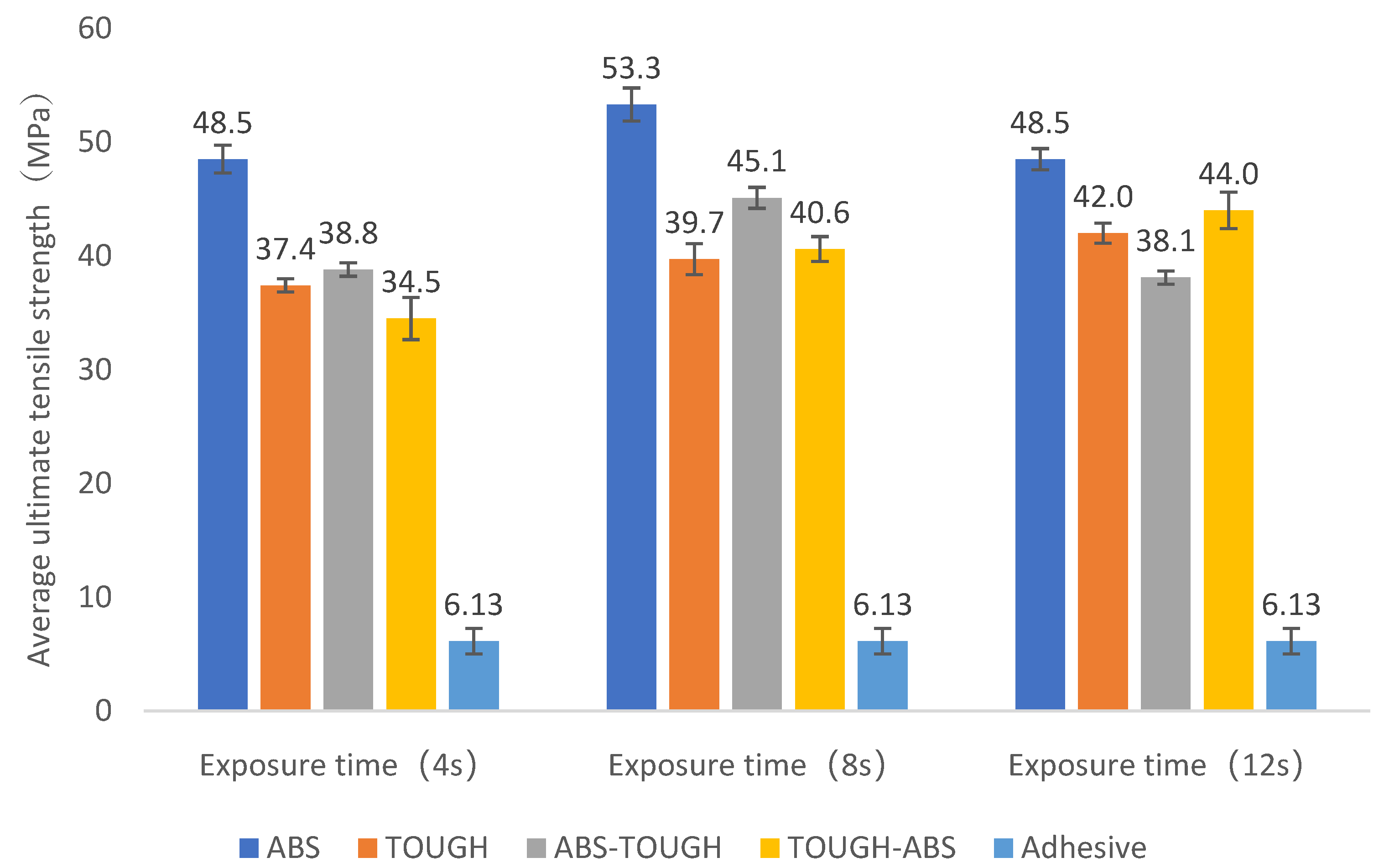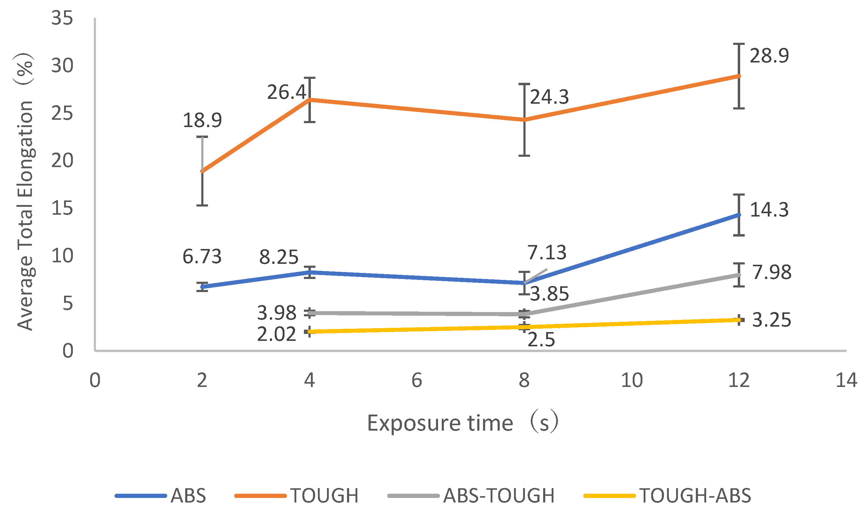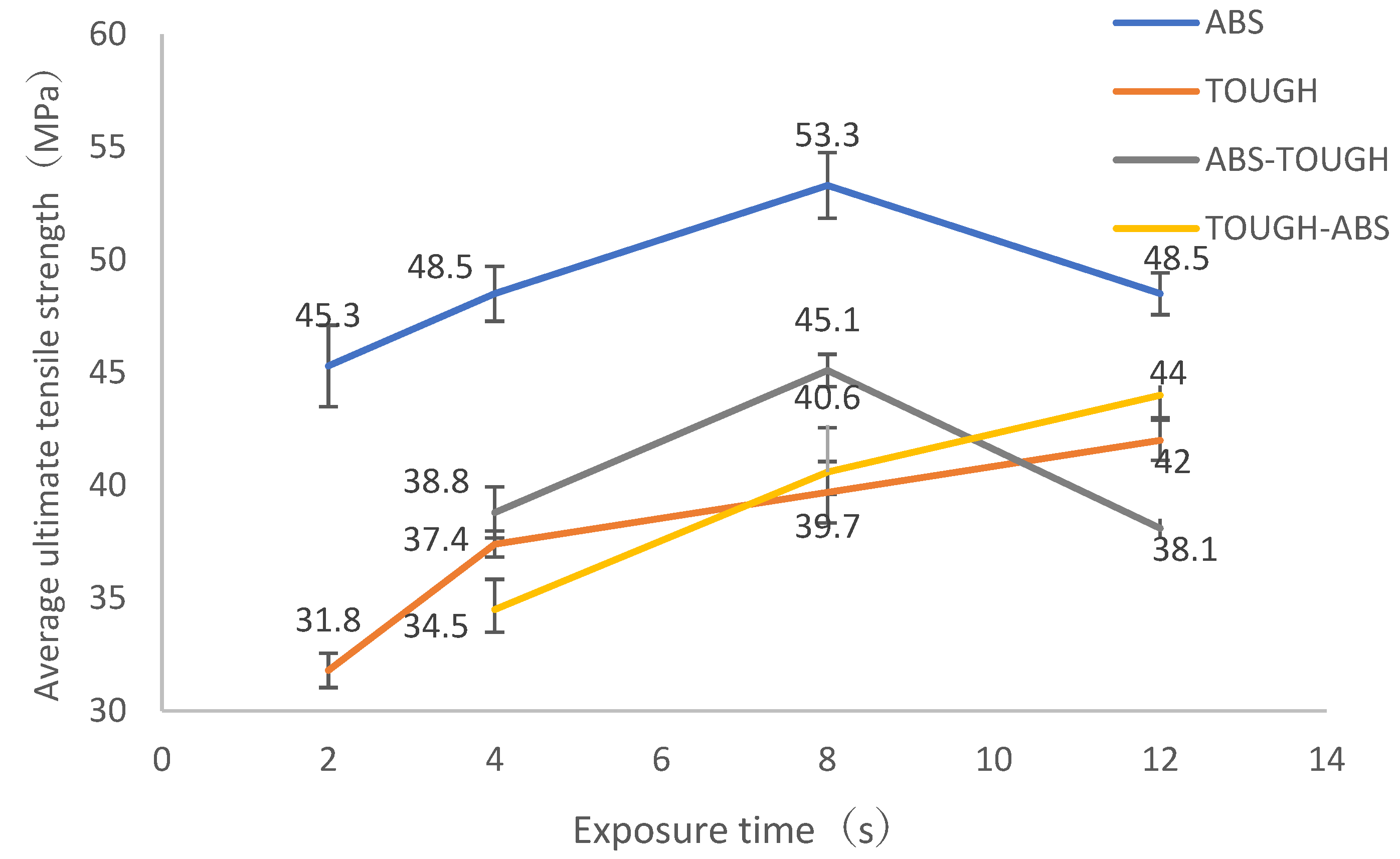 - The single-material specimens showed a relationship between exposure time and tensile strength and elongation. Similarly, the multi-material specimens showed an increase in tensile strength followed by a decrease with increasing exposure time. However, further research on elongation is warranted;