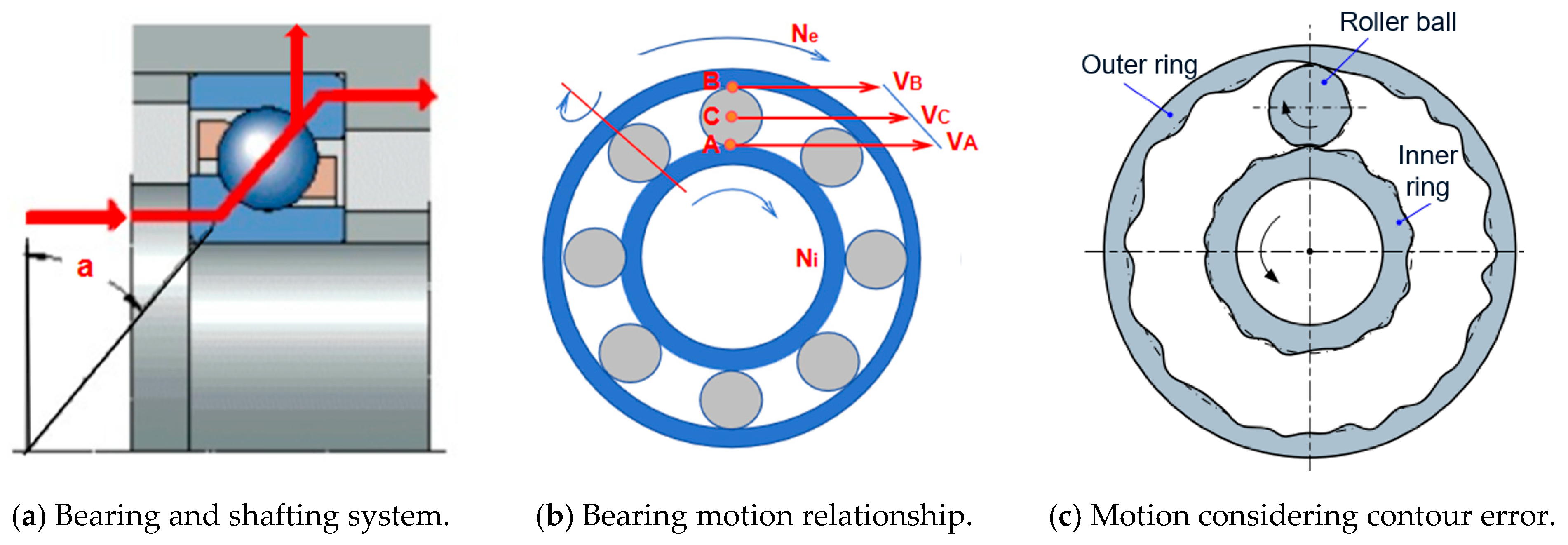 Figure 1b. The motion of rolling elements is the most complex, with both revolution, rotation, and spin. In the process of movement, the size and contour error of bearing parts leads to the large runout of bearing in radial and axial directions, which is the main reason for the unstable accuracy of bearing and shafting system in the working process, as shown in