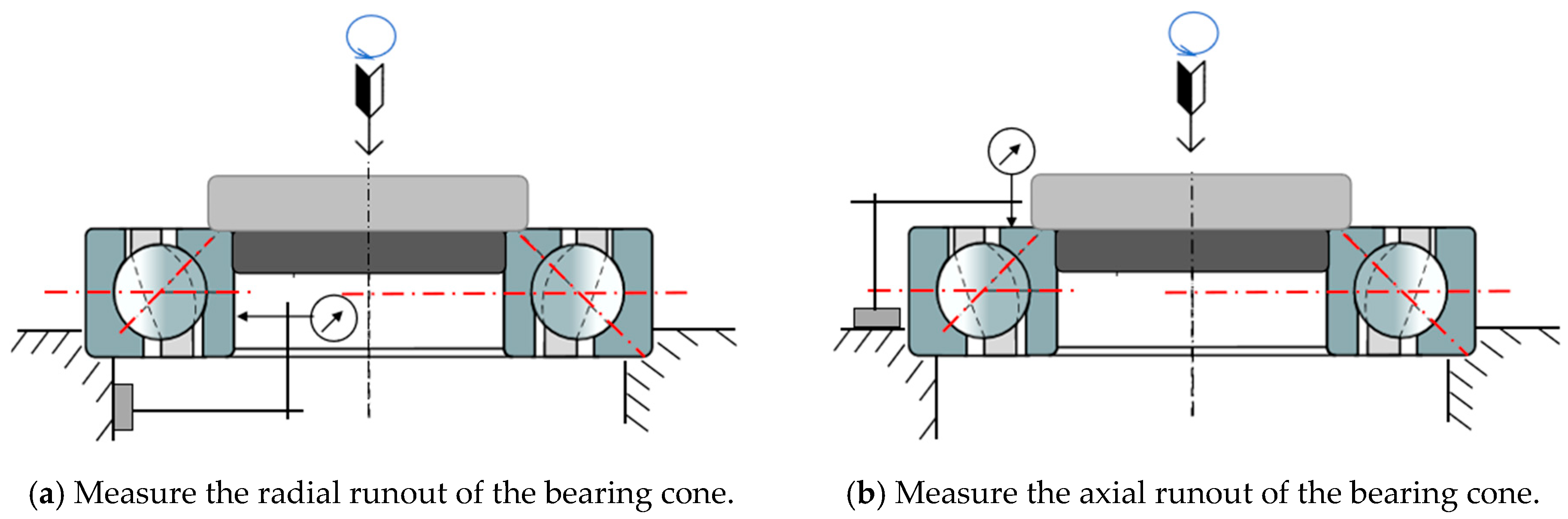 Figure 3a,b, the radial runout Kia and Kea of the bearing and the axial runout Sia and Sea are the superposition of the radial and axial errors of the broken line O
