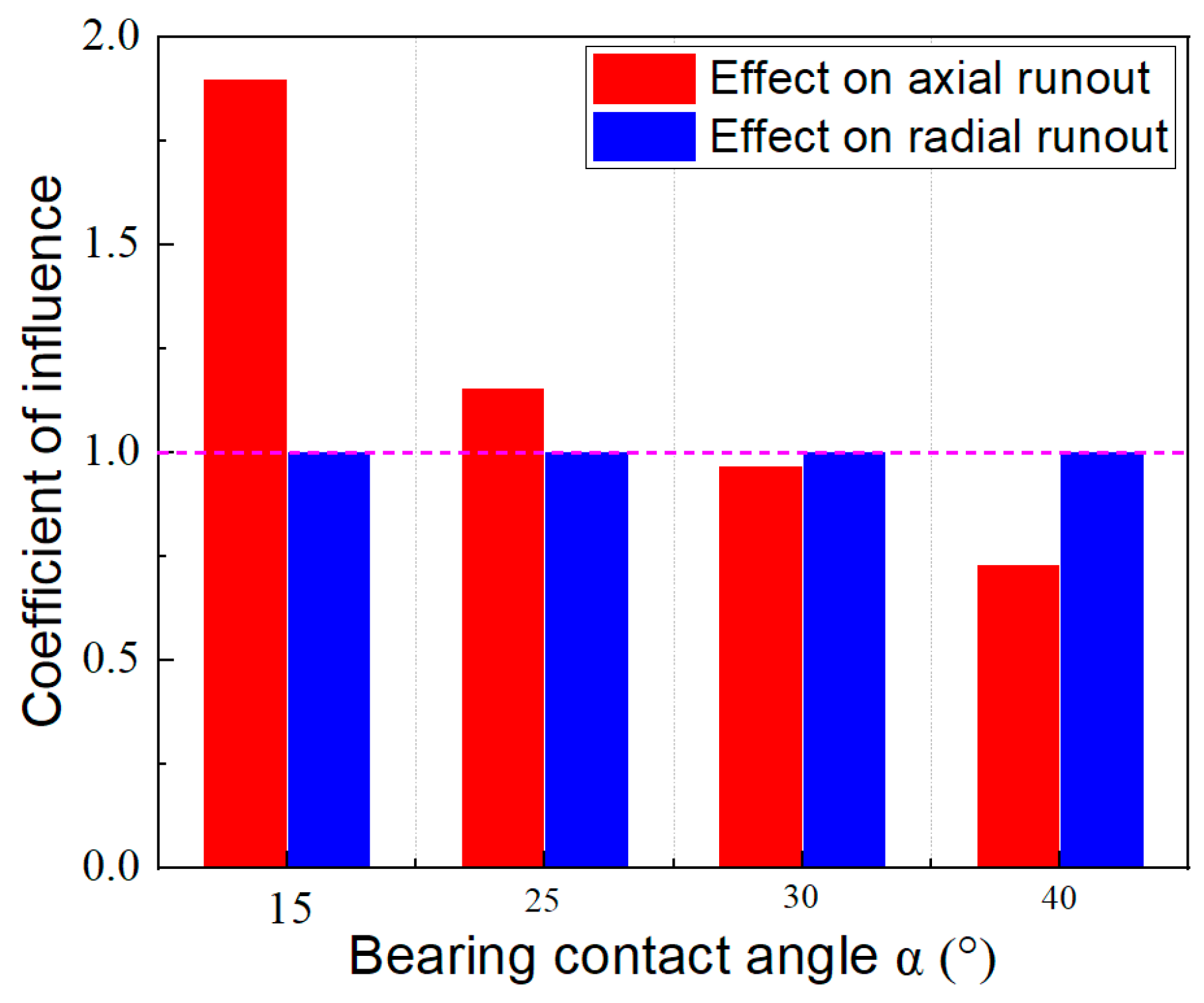 From the above, the influence of the roundness bearing ring channel on overall accuracy of bearing can be calculated. The ACBBs 7020C/P4, 7020AC/P4, 7020A/P4, and 7020B/P4 are calculated, respectively. The influence degree of channel roundness error on axial runout is 1.9, 1.155, 0.966, and 0.731 in turn, and the influence degree decreases in turn, while the influence coefficient on radial runout remains unchanged at 1, as shown in