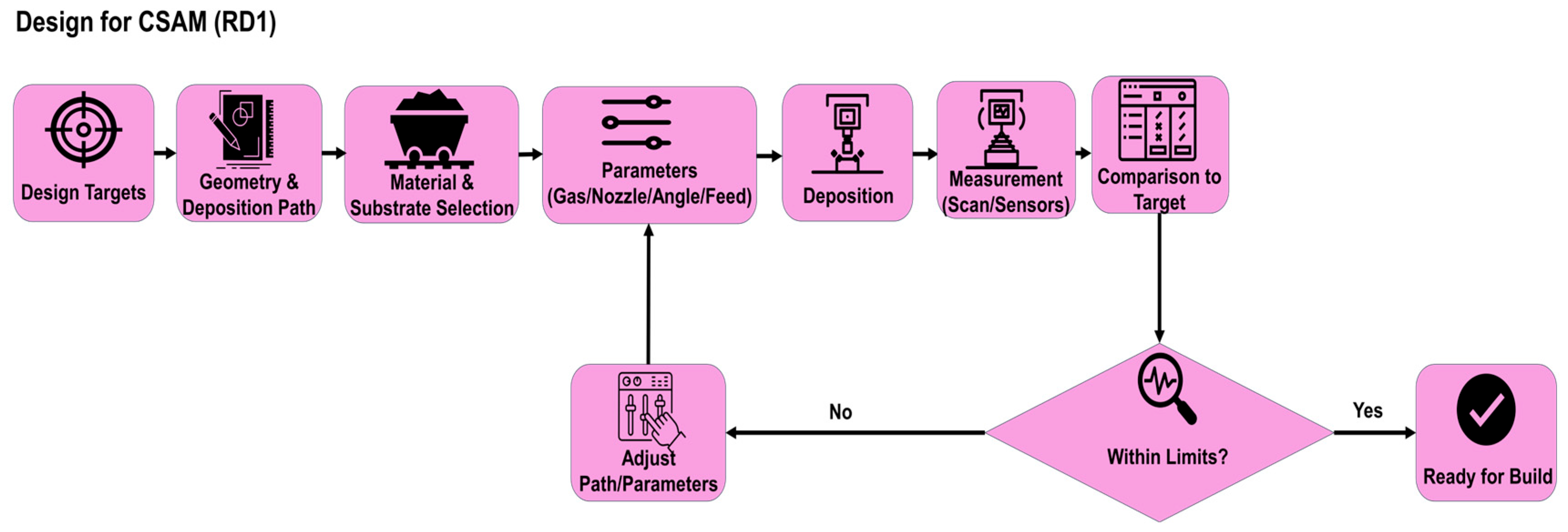 13 | [14] | RD1/RD4 | Deep Neural Networks (DNNs) for 2D and 3D shape prediction trained on physics-based analytical simulations; compared with Transformers, CNNs, LSTMs, Gaussian Mixture Model (GMM), XGBoost | Simulated single-track shapes generated with a physics-based analytical model, plus a smaller set of experimental cross-sections for validation | Predicting single-track cross-sections and full 3-D deposit geometry; using these predictions inside an adaptive slicing and tool-path framework to inimize waviness/overspray. | Ti-6Al-4V powder (AP&C) | 2400 simulated linear tracks (each 30 mm long) (full-factorial DoE on 4 input variables: scanning speed, spray angle, standoff distance). | Lower accuracy at the domain edges; difficulty capturing profile asymmetry at high spray angles; need to handle curved substrates and shadowing in future work. | Shape prediction: 2D DNN—Relative L2 error 0.59%, MSE 8.06 × 10−5, R2 0.999 (simulated); 3D DNN—Relative L2 error 2.62%; Experimental validation: MSE ≈ 9.4 × 10−3, R2 0.981, MAPE 16%. |