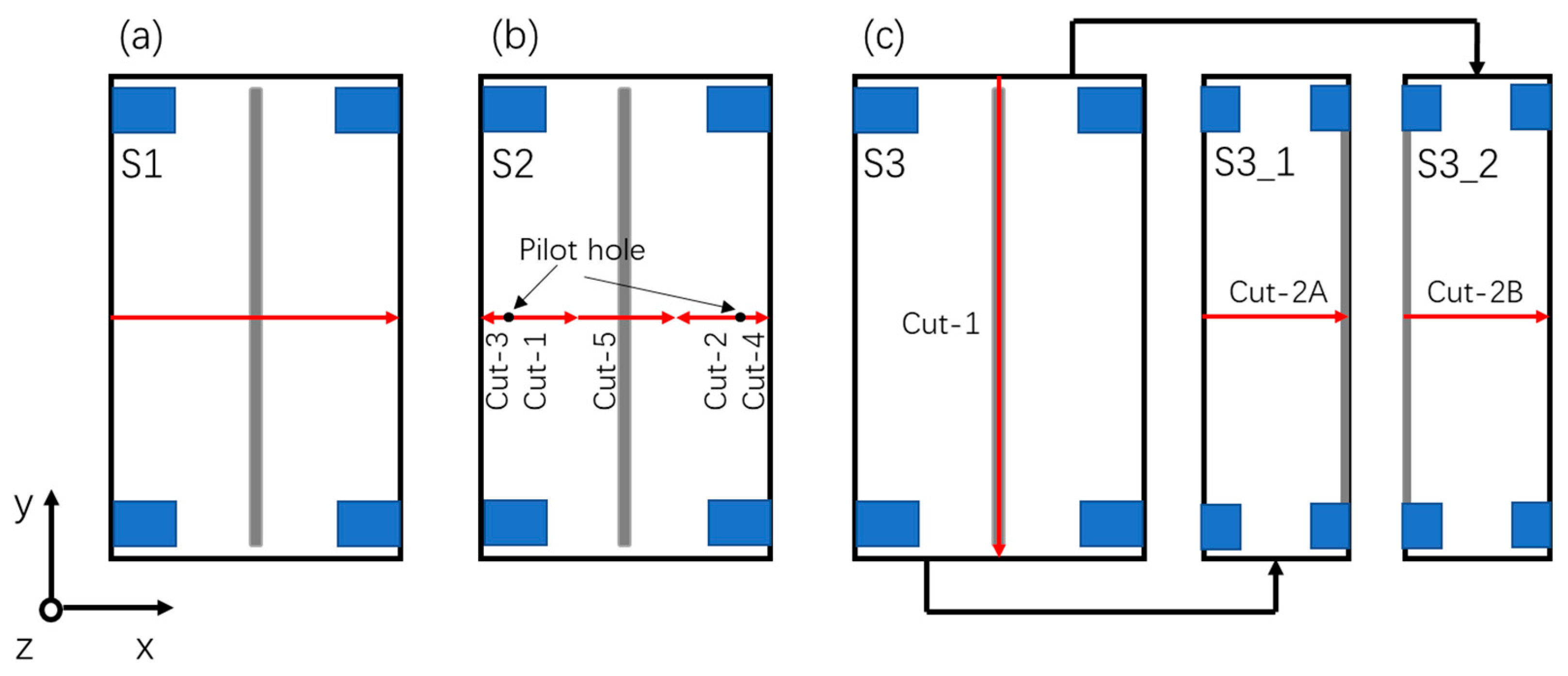 Figure 8. The first weldment was cut using a conventional edge-crack cutting configuration (S1), and the second employed the double-embedded cutting configuration (S2). The third weldment (S3) was first cut along the WCL in order to reduce residual stress levels in the cut parts. Then, one of the half-plates was cut (S3_1) from the free edge to the WCL, and the other half-plate was cut (S3_2) from the WCL to the edge, as illustrated in