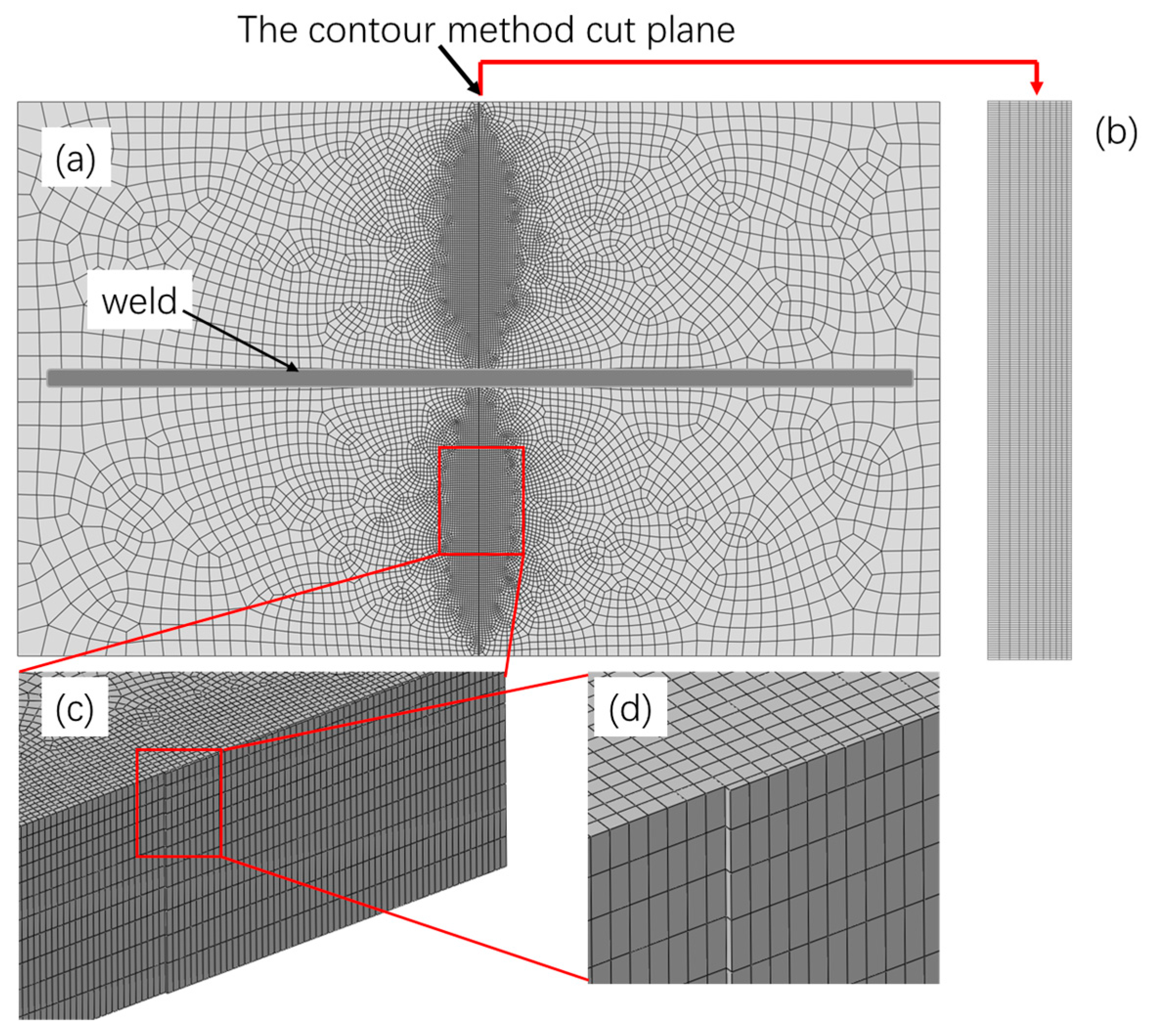 35]. This simplified welding residual stress simulation approach offered the advantage of significantly reduced computational time compared with a full moving heat-source type of thermo-mechanical weld pass deposition analysis. Moreover, it allowed the creation of the high-resolution FE mesh required to study the impact of Contour Method cutting sequence on CIP, for which a total of 138,897 linear hexahedral eight-node elements (C3D8R) were employed. The finest mesh resolution is situated at the top of the cut plane, with element sizes of 0.5 mm along the